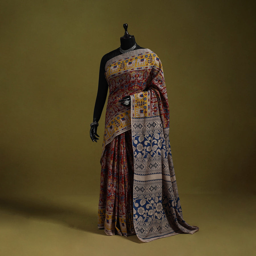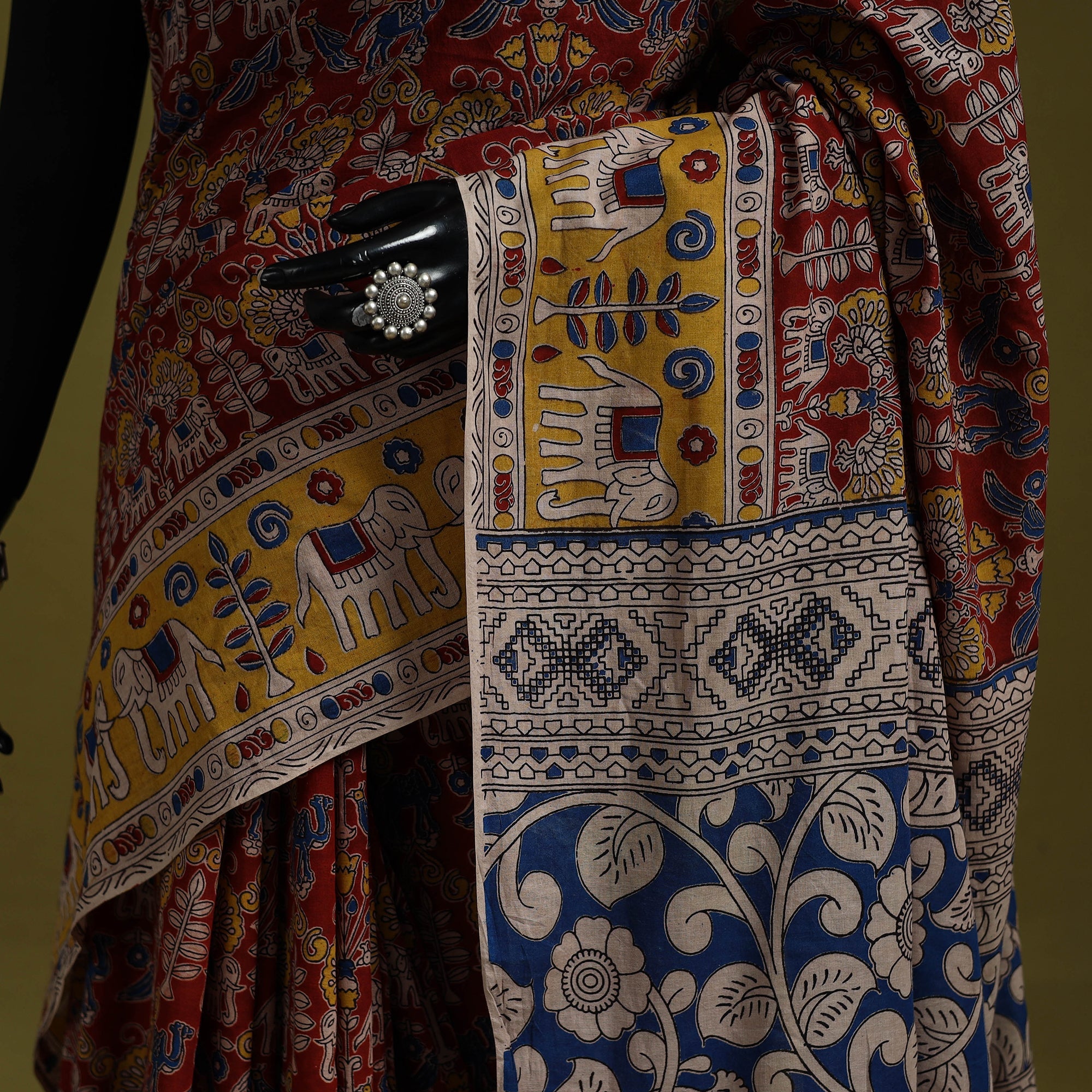 Pure cotton kalamkari saree from Nellore, Andhra Pradesh. Adorned with intricate storytelling motifs, it features detailed screen printed patterns inspired by florals, vines, figures and elephants, highlighting the cultural depth and narrative style of Kalamkari art perfect for cultural gatherings, festive occasions, office wear and graceful everyday outings.
