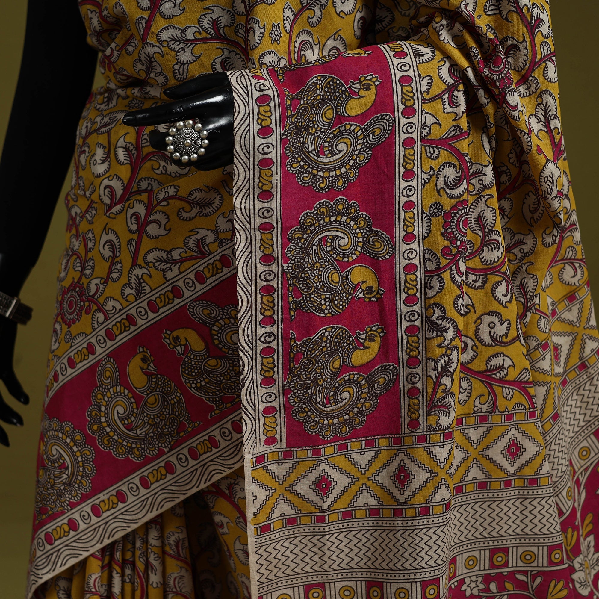 Pure cotton kalamkari saree from Nellore, Andhra Pradesh. Adorned with intricate storytelling motifs, it features detailed screen printed patterns inspired by florals, vines, figures and elephants, highlighting the cultural depth and narrative style of Kalamkari art perfect for cultural gatherings, festive occasions, office wear and graceful everyday outings.