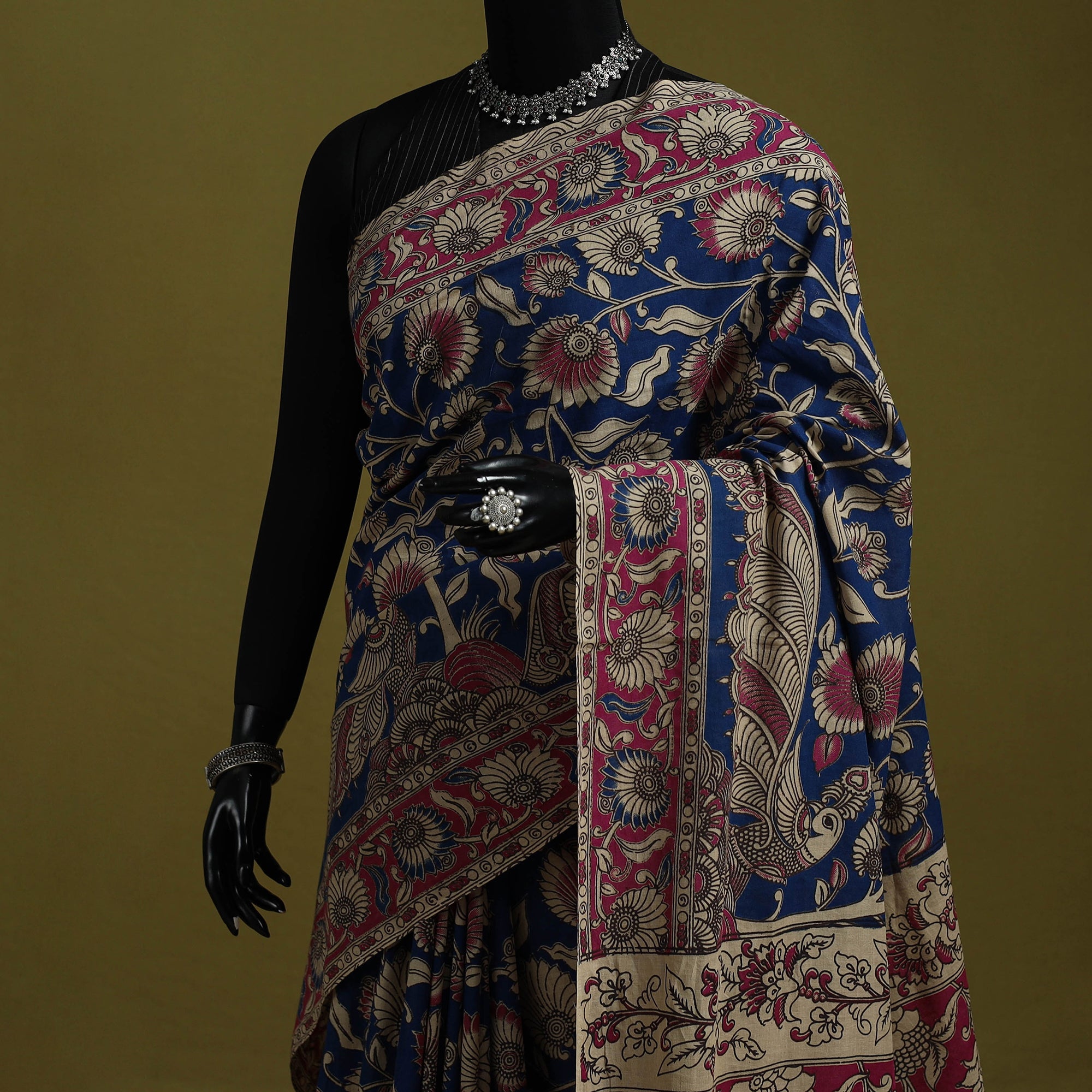 Pure cotton kalamkari saree from Nellore, Andhra Pradesh. Adorned with intricate storytelling motifs, it features detailed screen printed patterns inspired by florals, vines, figures and elephants, highlighting the cultural depth and narrative style of Kalamkari art perfect for cultural gatherings, festive occasions, office wear and graceful everyday outings.