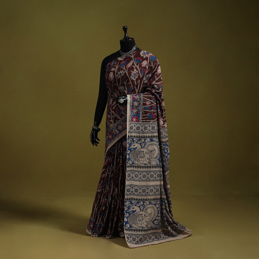Pure cotton kalamkari saree from Nellore, Andhra Pradesh. Adorned with intricate storytelling motifs, it features detailed screen printed patterns inspired by florals, vines, figures and elephants, highlighting the cultural depth and narrative style of Kalamkari art perfect for cultural gatherings, festive occasions, office wear and graceful everyday outings.