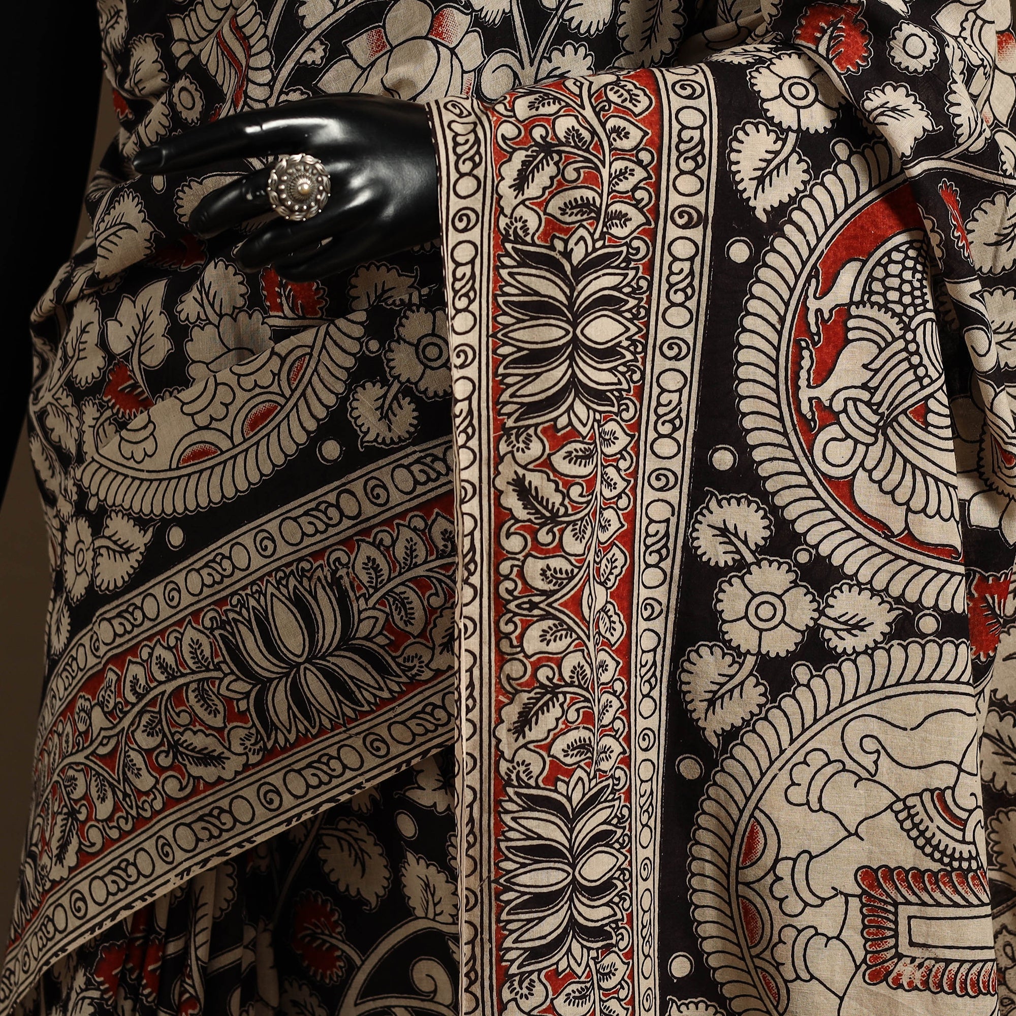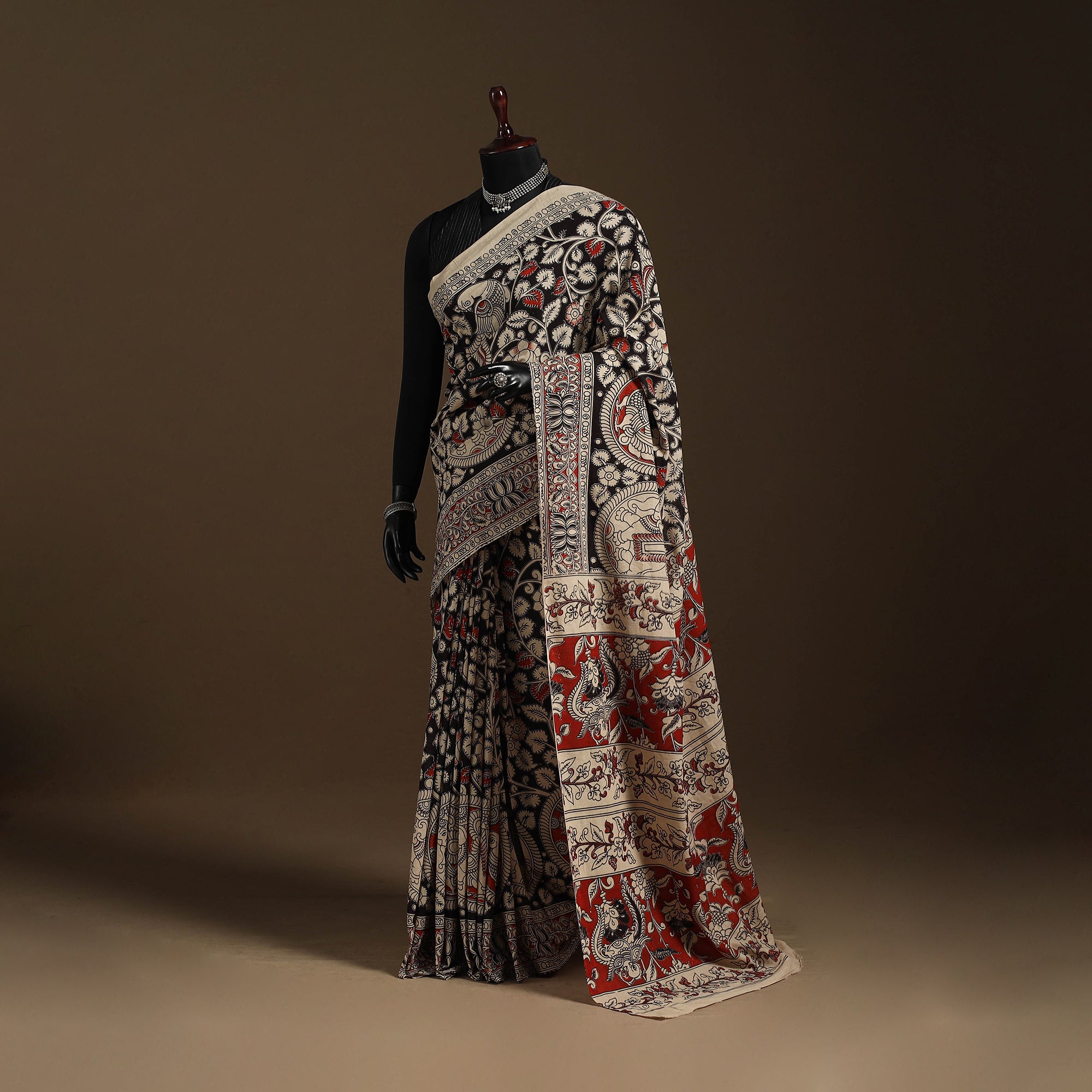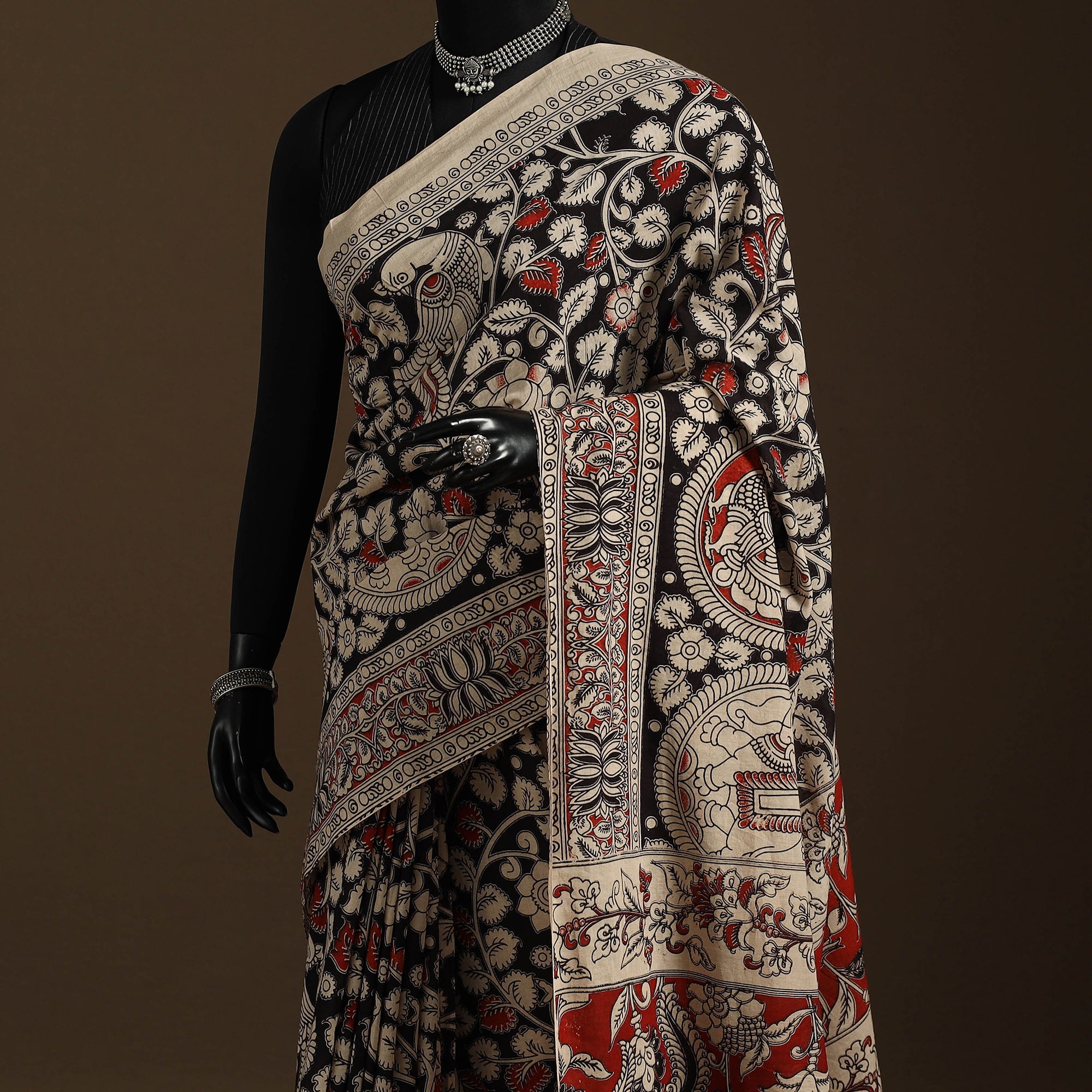 | Material | This black cotton kalamkari saree celebrates the charm of Nellore’s artistic traditions in Andhra Pradesh. Featuring intricate storytelling motifs, it showcases beautifully block-printed patterns inspired by florals, vines, figures, and elephants. Each detail adds a distinctive character, reflecting the cultural depth of Kalamkari art. Perfect for occasions where tradition meets elegance. |