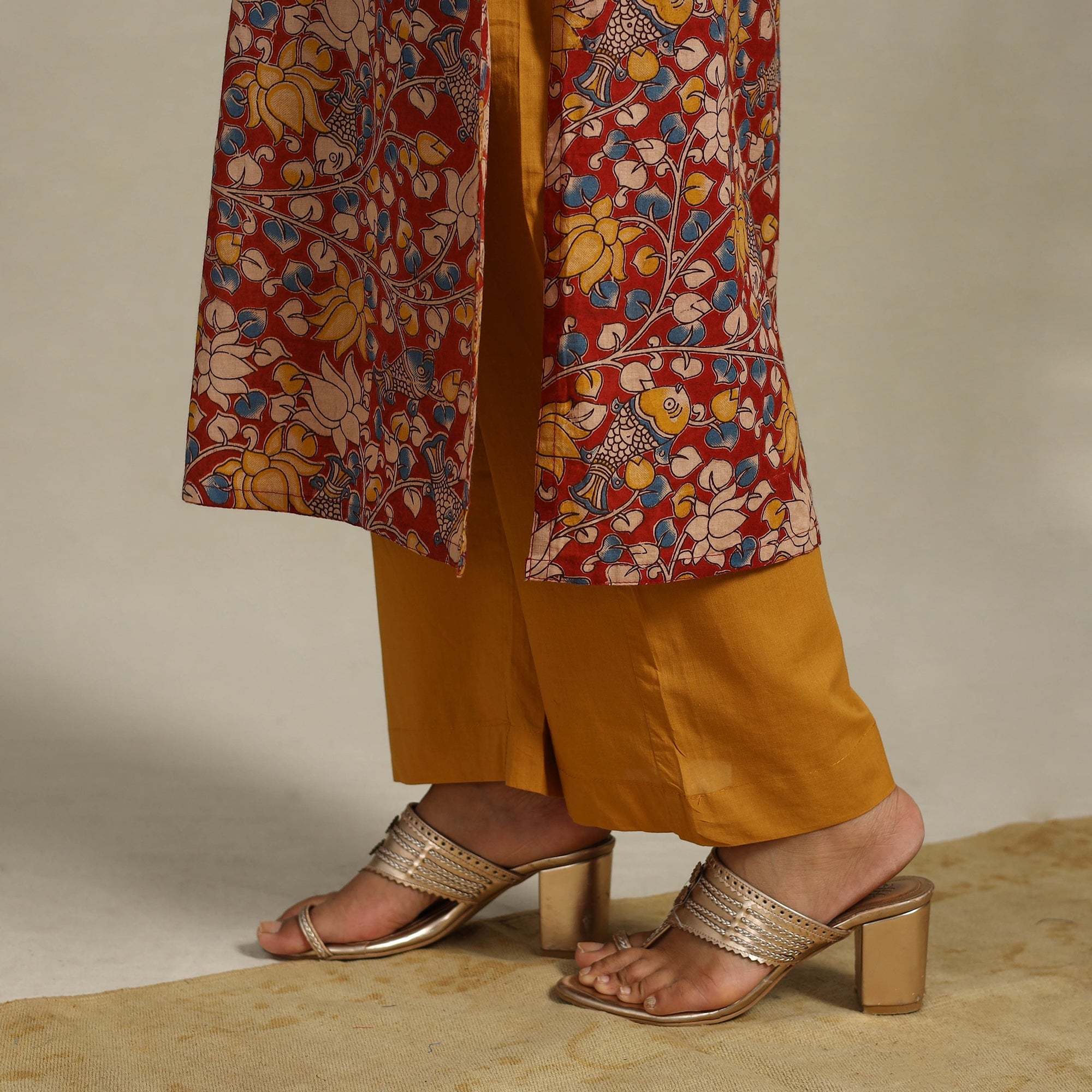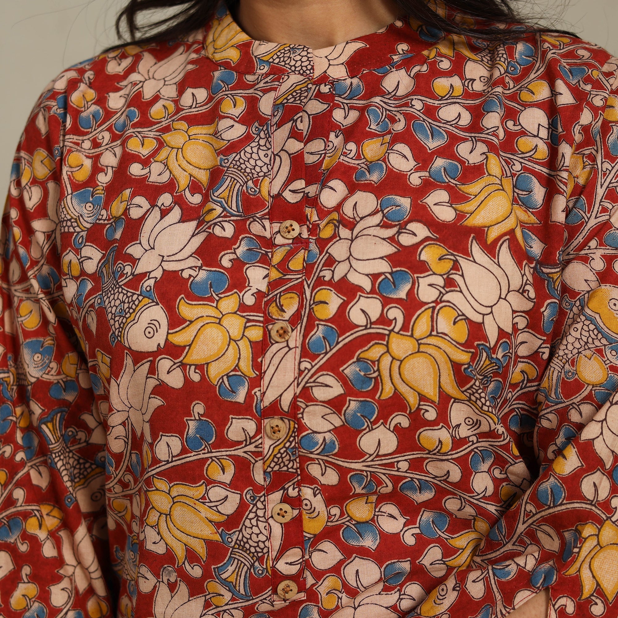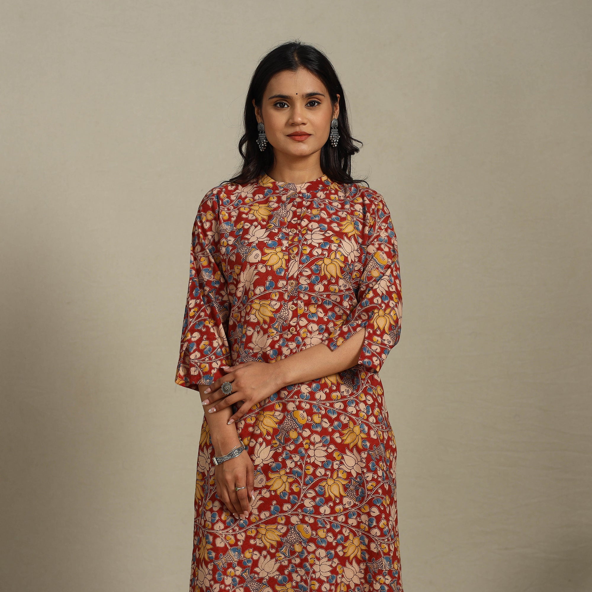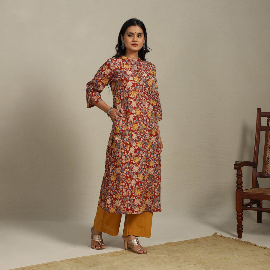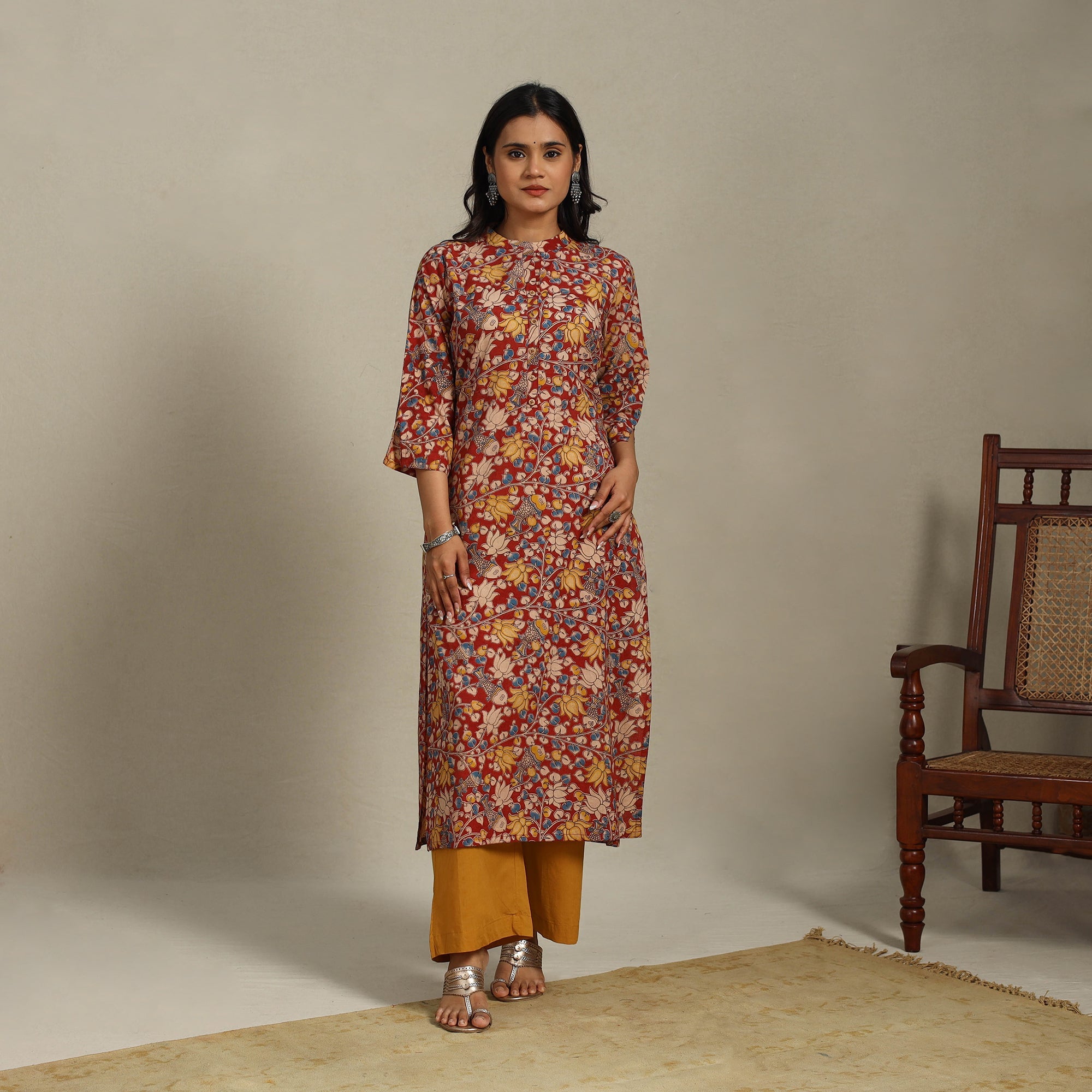 Stay comfortable all day in this red screen printed cotton straight kurta featuring kalamkari-inspired motifs. Crafted from breathable fabric, the lightweight material feels soft on the skin while offering style and easy movement. With a functional side pocket, it’s ideal for festive gatherings, casual outings, or everyday workwear.
