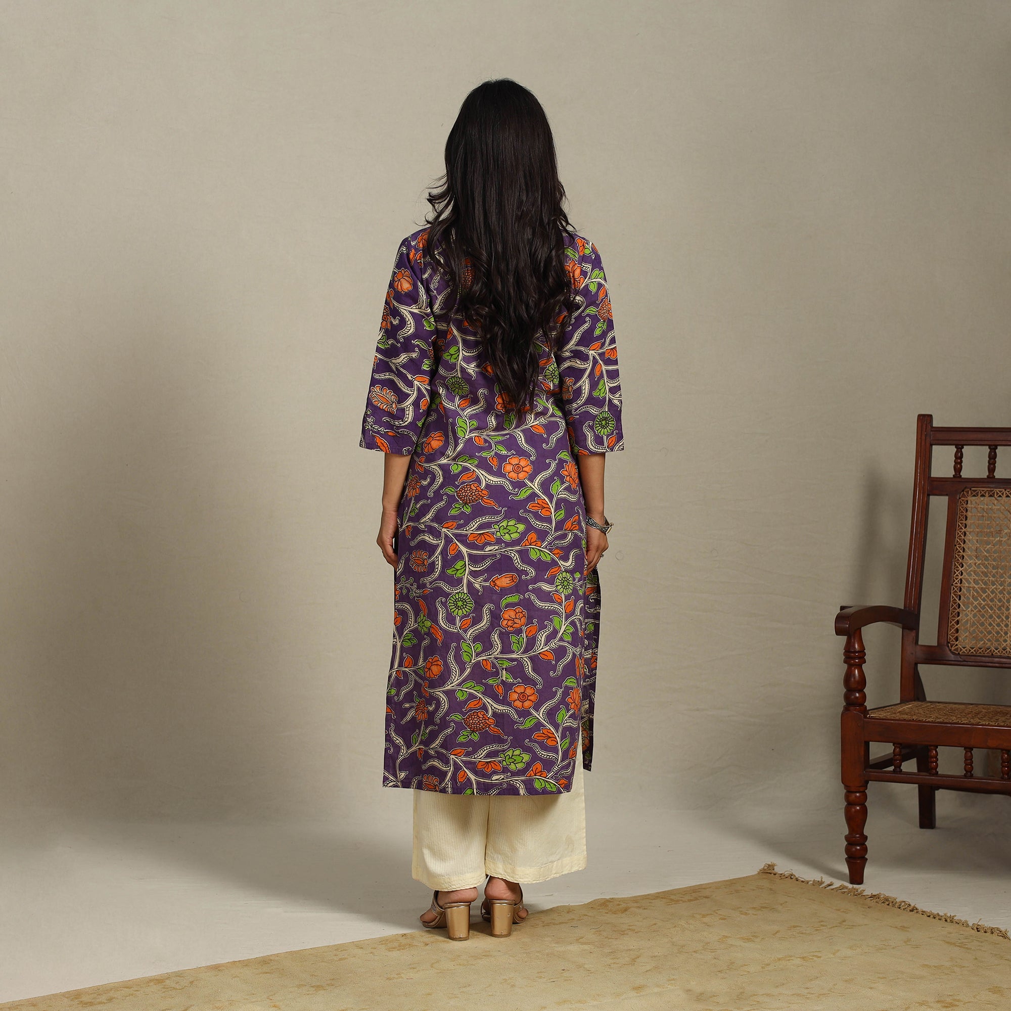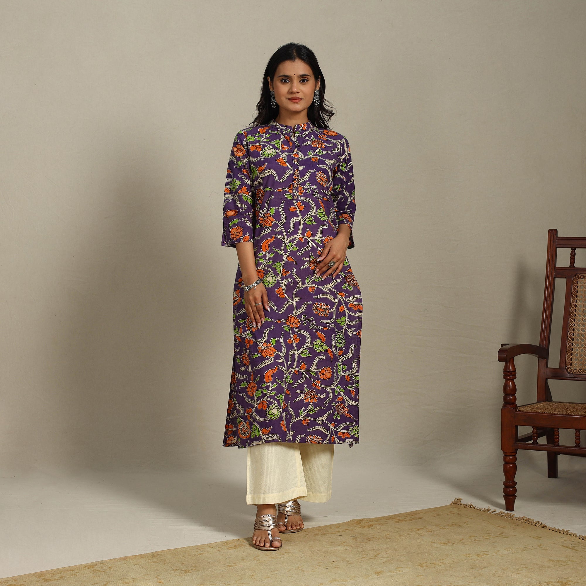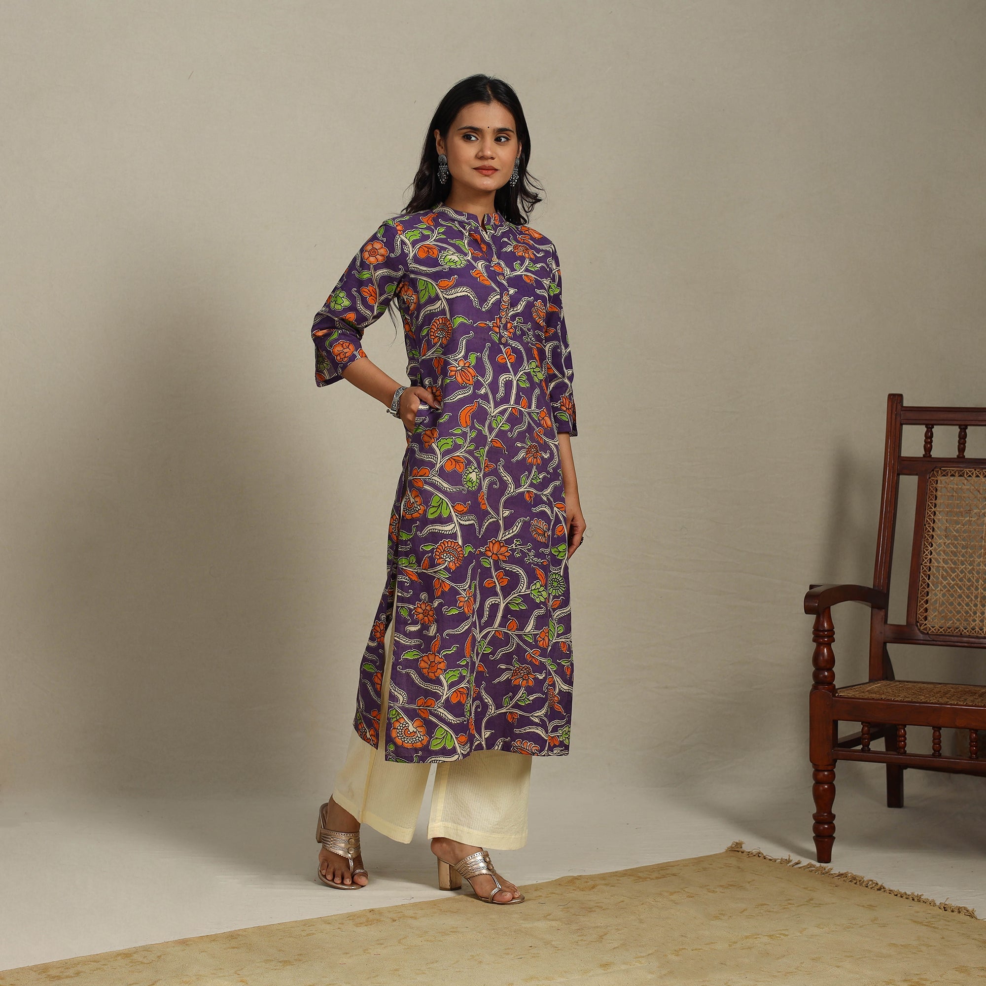 Stay comfortable all day in this purple screen printed cotton straight kurta featuring kalamkari-inspired motifs. Crafted from breathable fabric, the lightweight material feels soft on the skin while offering style and easy movement. With a functional side pocket, it’s ideal for festive gatherings, casual outings, or everyday workwear.