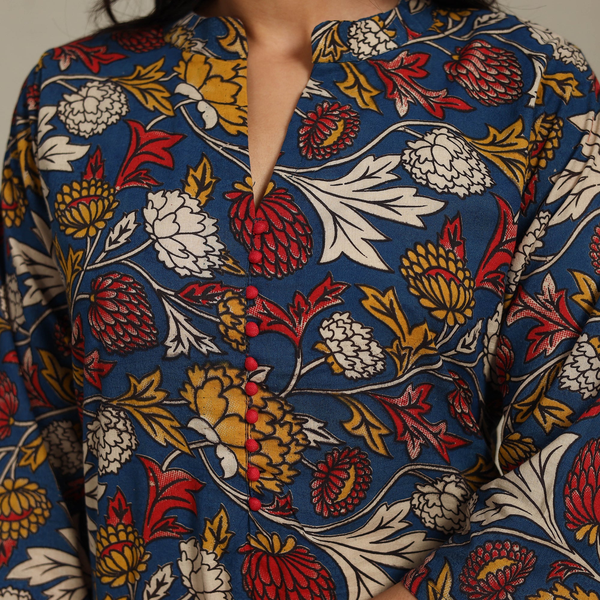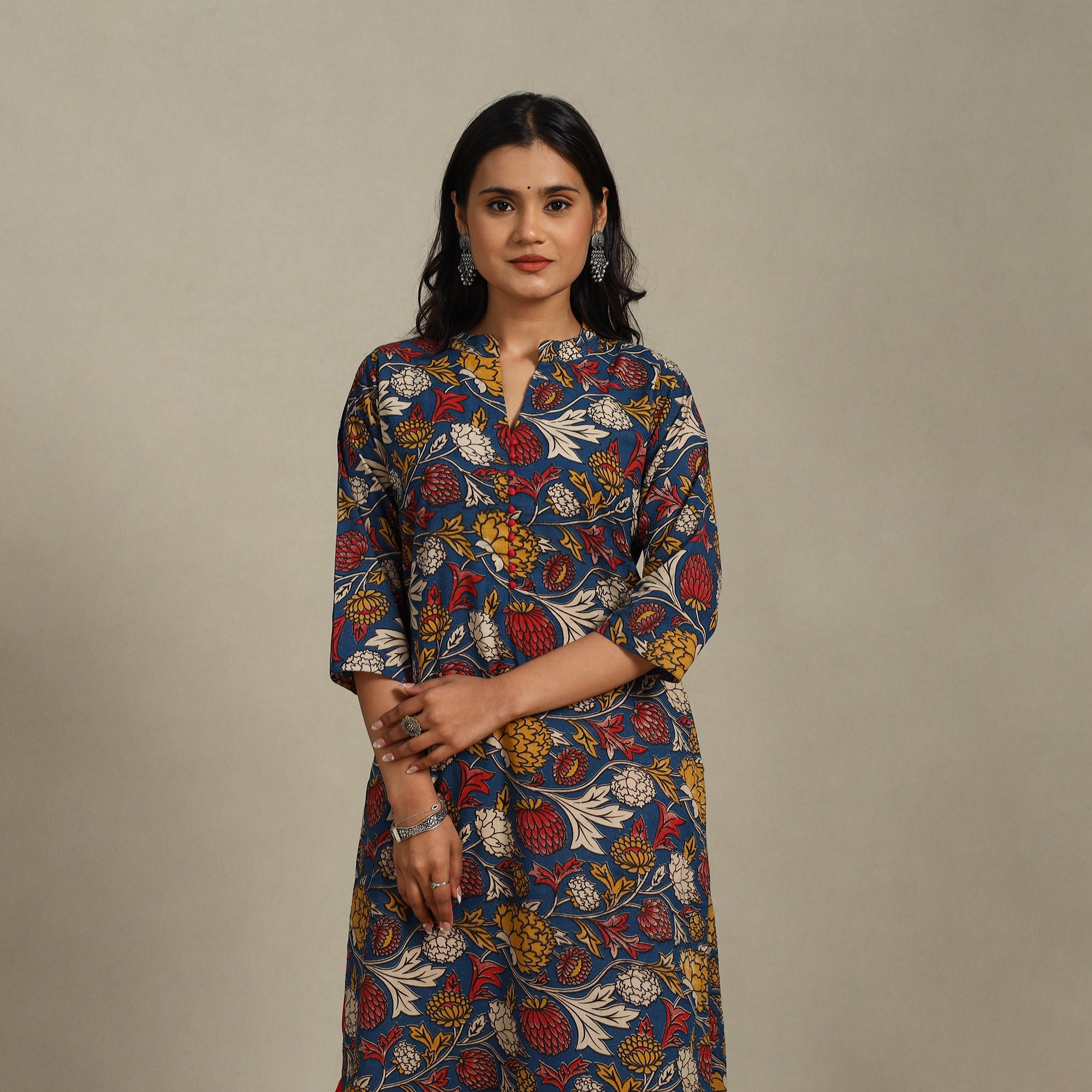 Stay comfortable all day in this blue screen printed cotton straight kurta featuring kalamkari-inspired motifs. Crafted from breathable fabric, the lightweight material feels soft on the skin while offering style and easy movement. With a functional side pocket, it’s ideal for festive gatherings, casual outings, or everyday workwear.