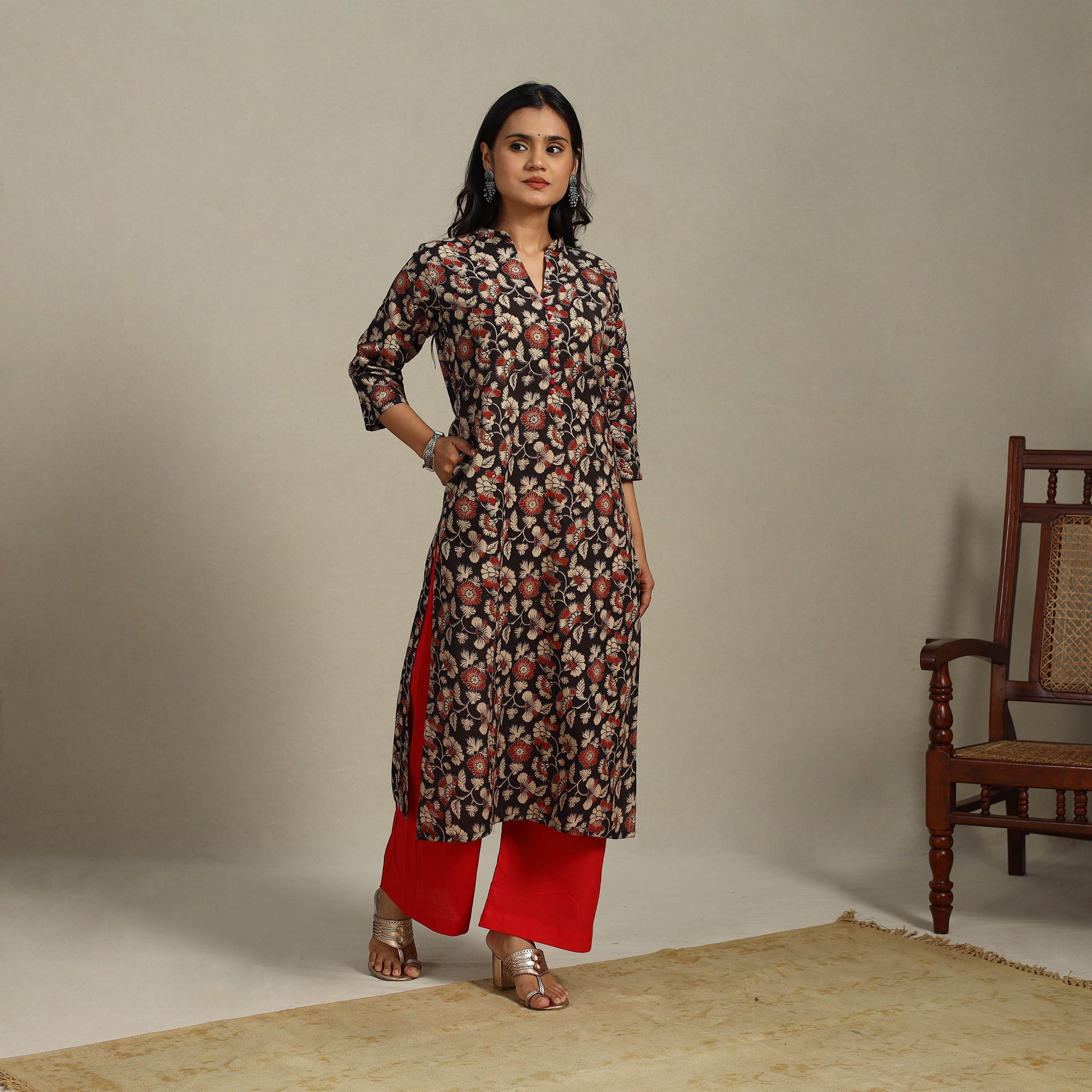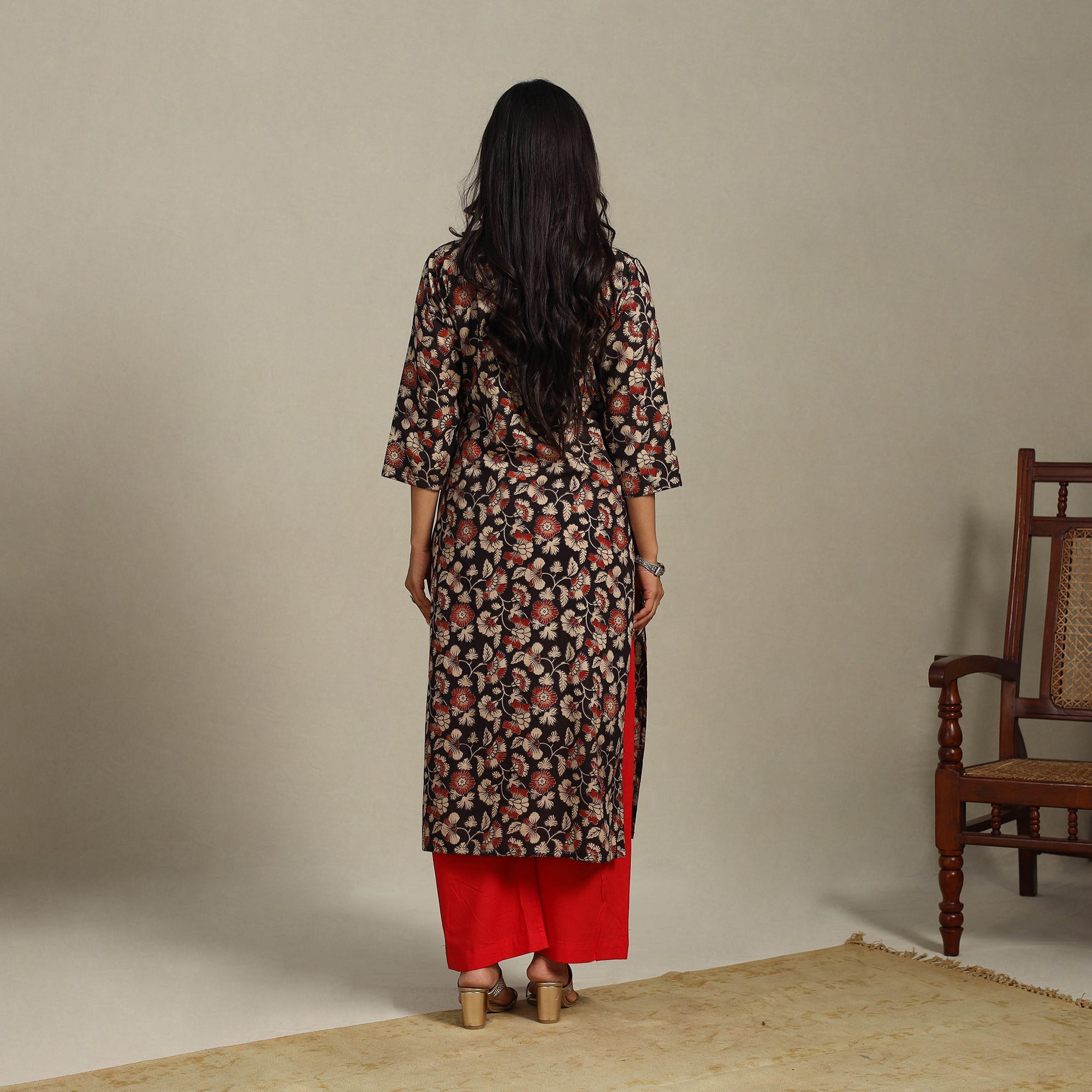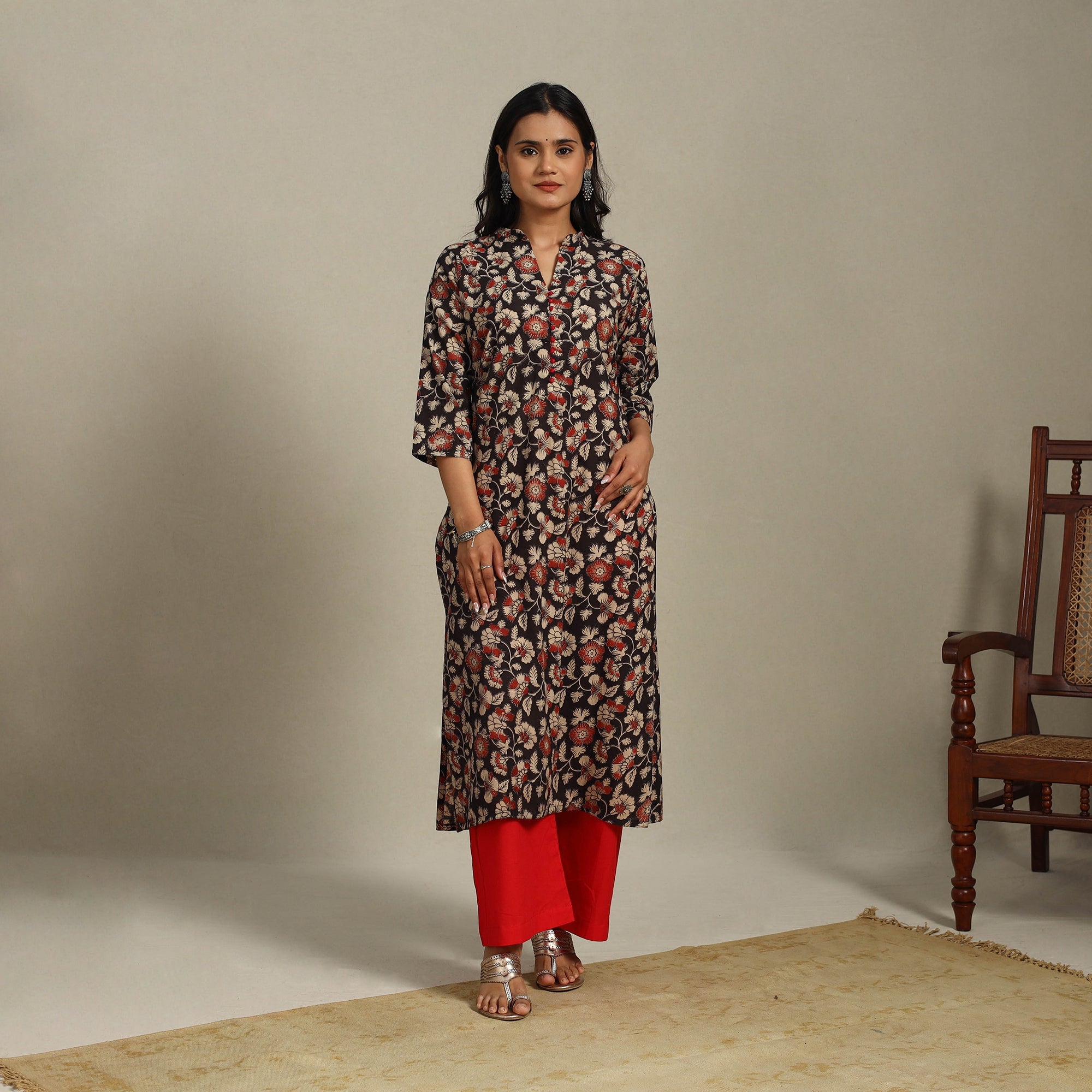 Stay comfortable all day in this black screen printed cotton straight kurta featuring kalamkari-inspired motifs. Crafted from breathable fabric, the lightweight material feels soft on the skin while offering style and easy movement. With a functional side pocket, it’s ideal for festive gatherings, casual outings, or everyday workwear.
