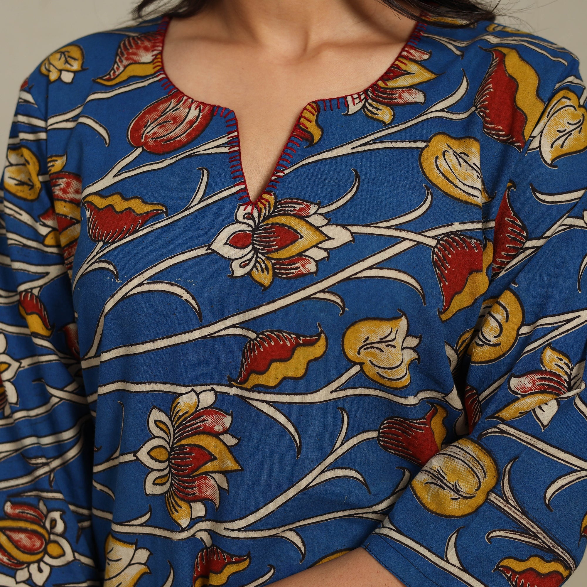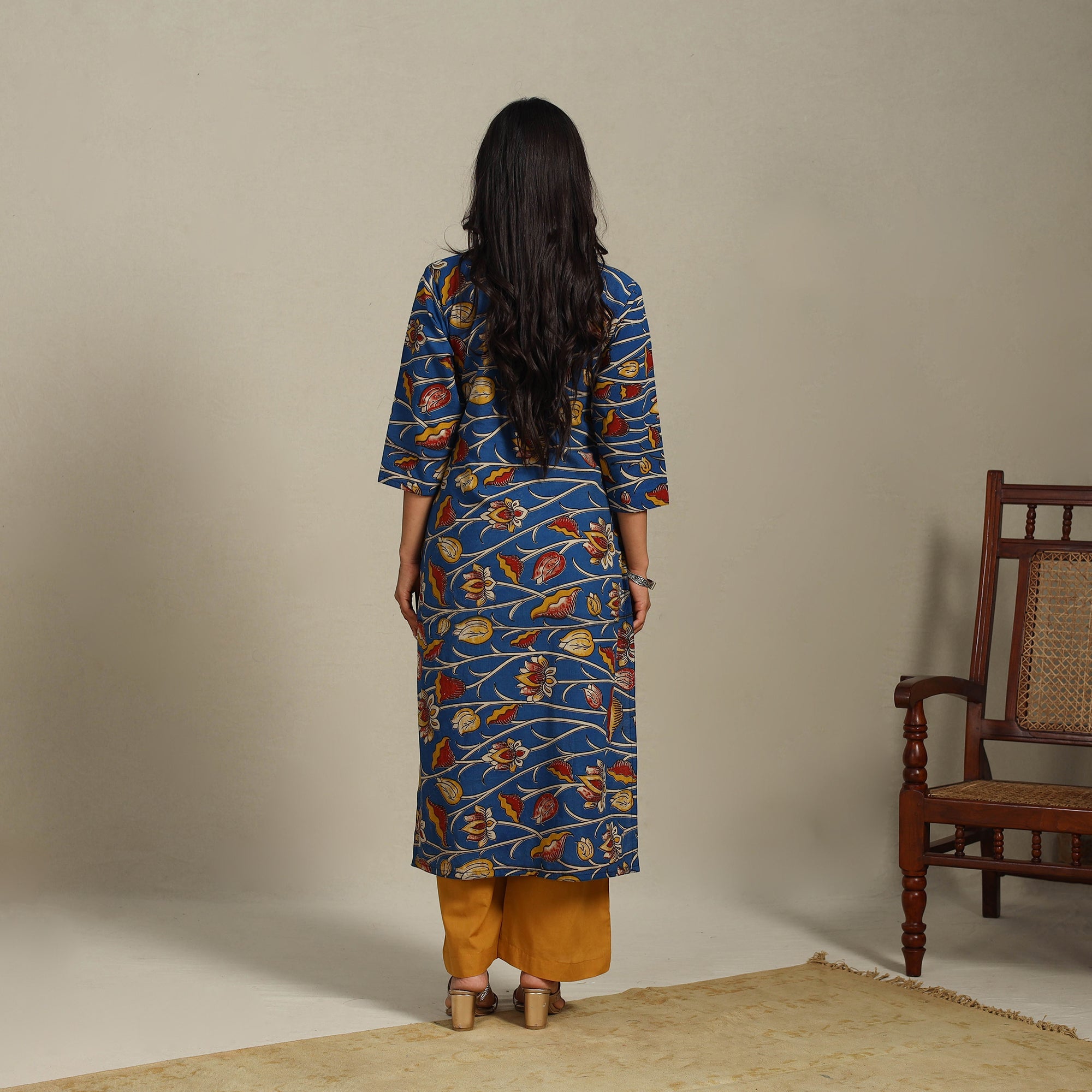 Stay comfortable all day in this blue straight cotton kurta, featuring kalamkari-inspired screen print and delicate hand embroidery. Crafted from breathable cotton, the lightweight fabric feels gentle on the skin while offering style and ease of movement. Designed with a practical side pocket, it’s ideal for festive gatherings, casual outings, or everyday workwear.