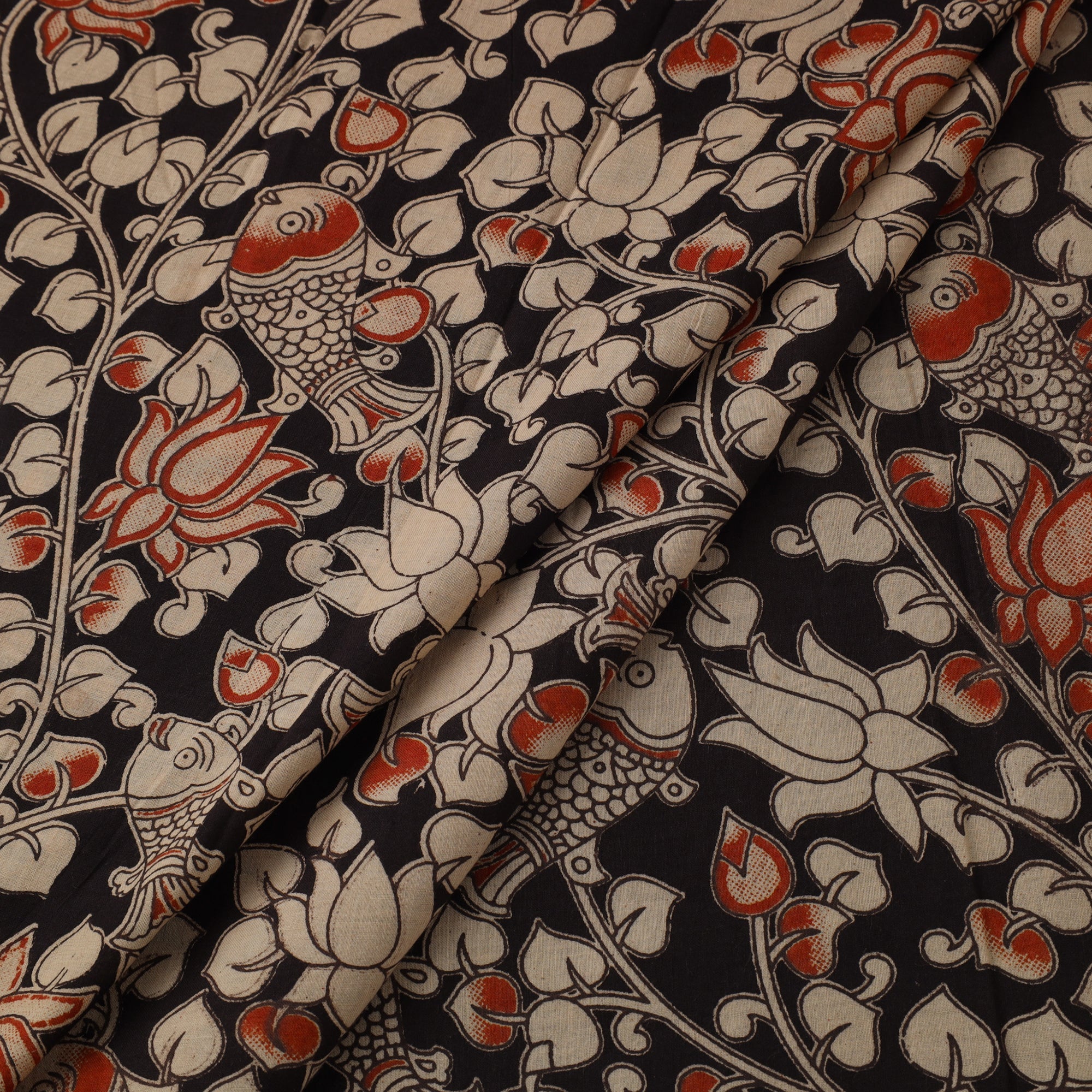 This black cotton fabric celebrates the charm of kalamkari art, known for its intricate and storytelling motifs. Featuring detailed screen-printed patterns like florals, vines, mudras, figurines, and elephants, each element adds character to the fabric. Made by Skill artisan from Andhra Pradesh, it’s ideal for apparel, home accents, or creative DIY projects.