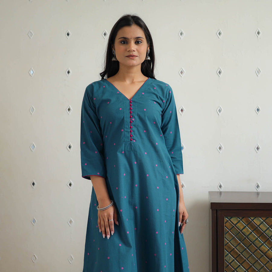 Feel comfortable in this pure teal blue cotton a-line jacquard kurta. Featuring a handy side pocket, it blends style and functionality seamlessly. Perfect for daily wear or special occasions, its breathable fabric ensures all-day comfort.