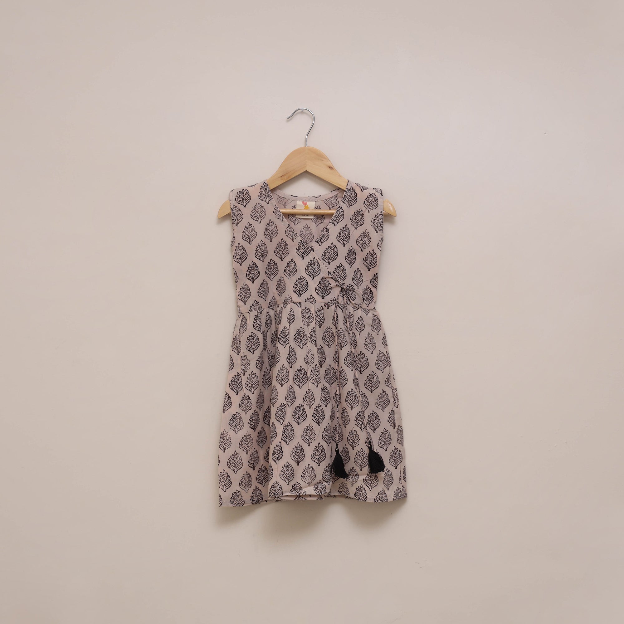 Baby girls dress in bagh prints, designed with angrakha-style front and dori detailing. Made from 100% pure cotton using bagh hand block printing technique. It is comfortable to wear and gentle on the skin. A lovely choice for your little one, this dress adds charm to her everyday look.