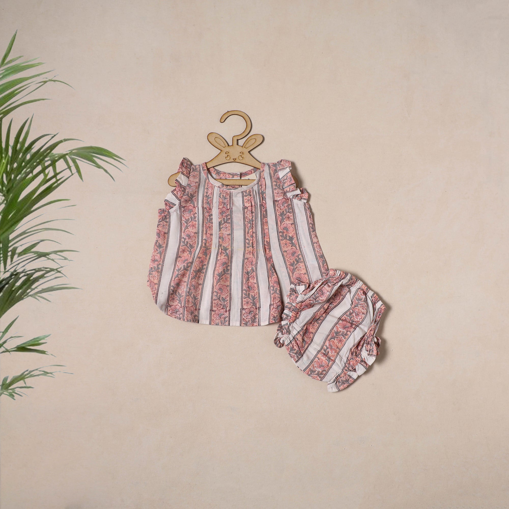 Baby girls top features a round neckline and a relaxed fit, paired with matching shorts with an elasticated waistband. Made from 100% pure cotton using the sanganeri hand block printing technique, known for its floral patterns it is comfortable to wear and gentle on the skin. A lovely choice for your little one, this set adds charm to her everyday look.