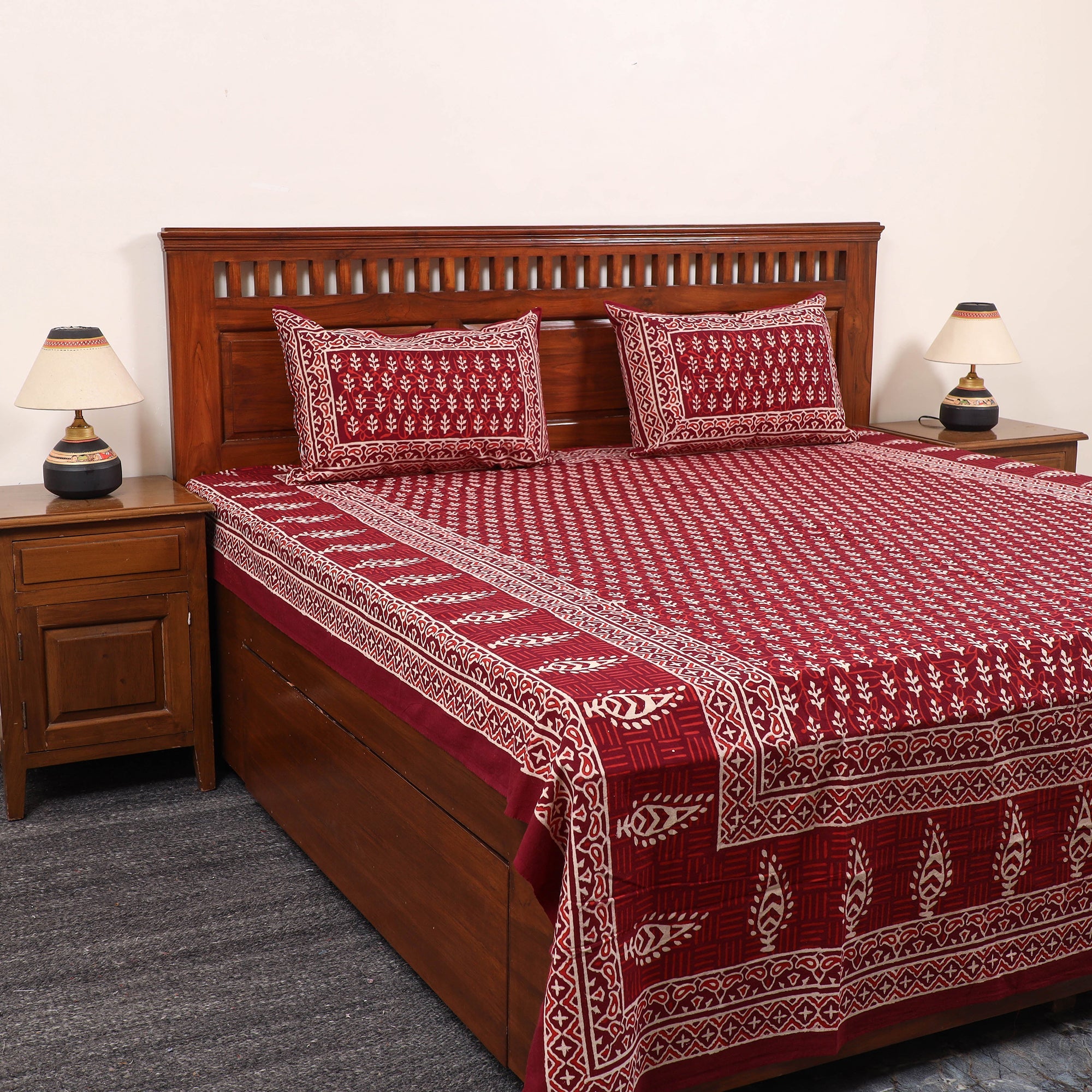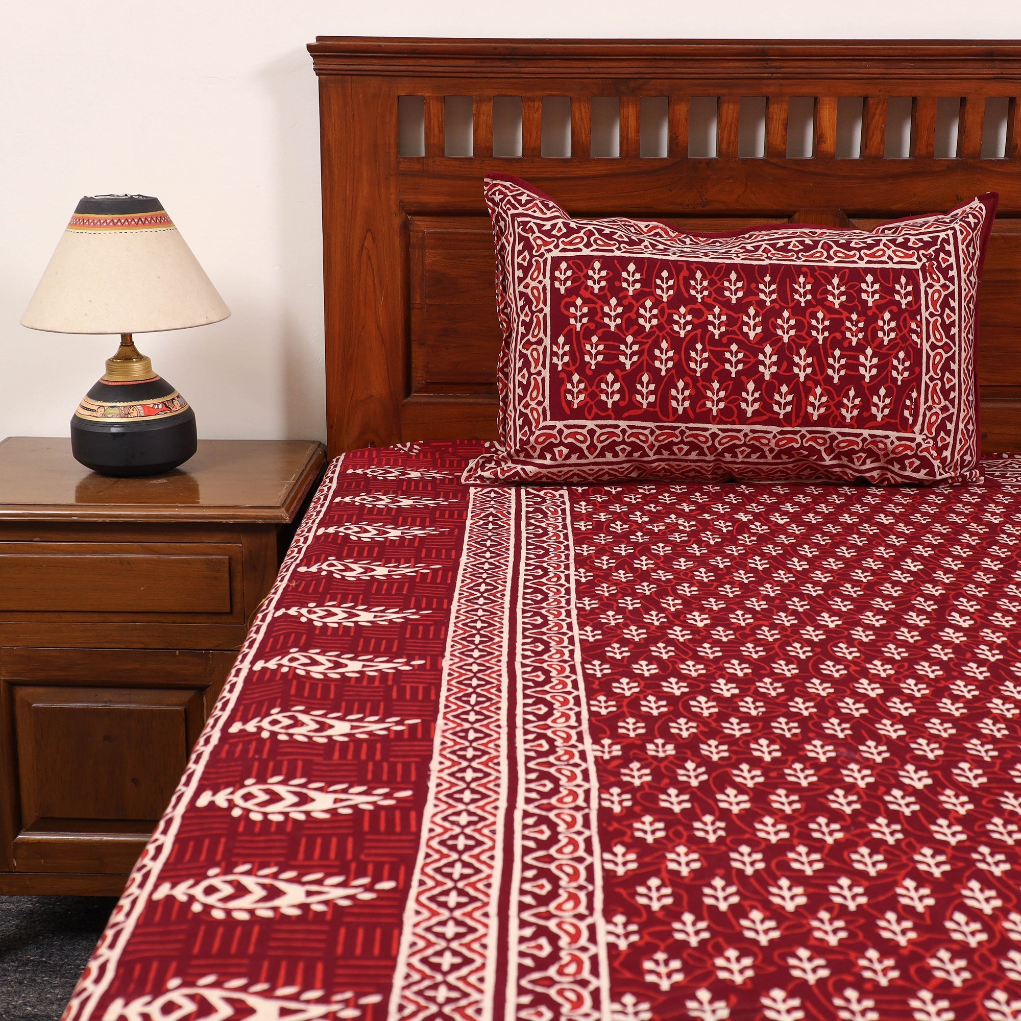 Elevate your bedroom decor with this red pure cotton single sanganeri print bed sheet. Crafted by artisans using traditional block printing techniques from Rajasthan. it showcases designs and colors that add a touch of elegance to your bedroom. Made from cotton and dyed using bleed-free VAT dyes, it ensures durability and long-lasting beauty. Its double size comes with matching pillow covers, making it a complete set.