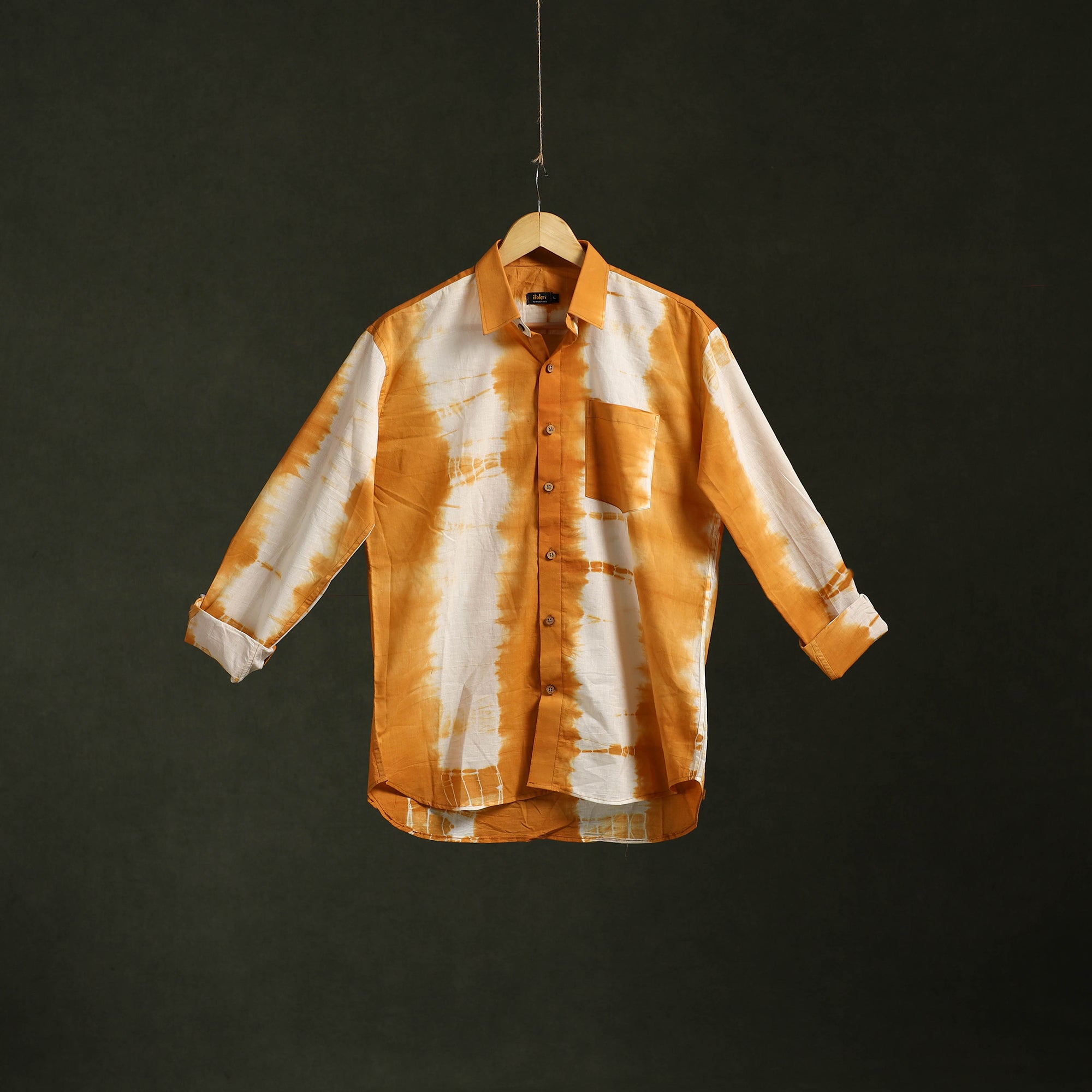 | Material | Yellow pure cotton men's shibori shirt is made using a traditional hand tie-dye technique that has been practiced for thousands of years. In this process, parts of the fabric are carefully tied before dyeing to create unique patterns. The soft and breathable cotton ensures all-day comfort, and bleed-free VAT dyes are used to maintain long-lasting colour and durability. The shirt features a regular collar and full sleeves, while wooden buttons add a touch of natural charm. A patch pocket on the front offers added convenience. It is suitable for daily outings, casual meet-ups and relaxed weekend occasions. |