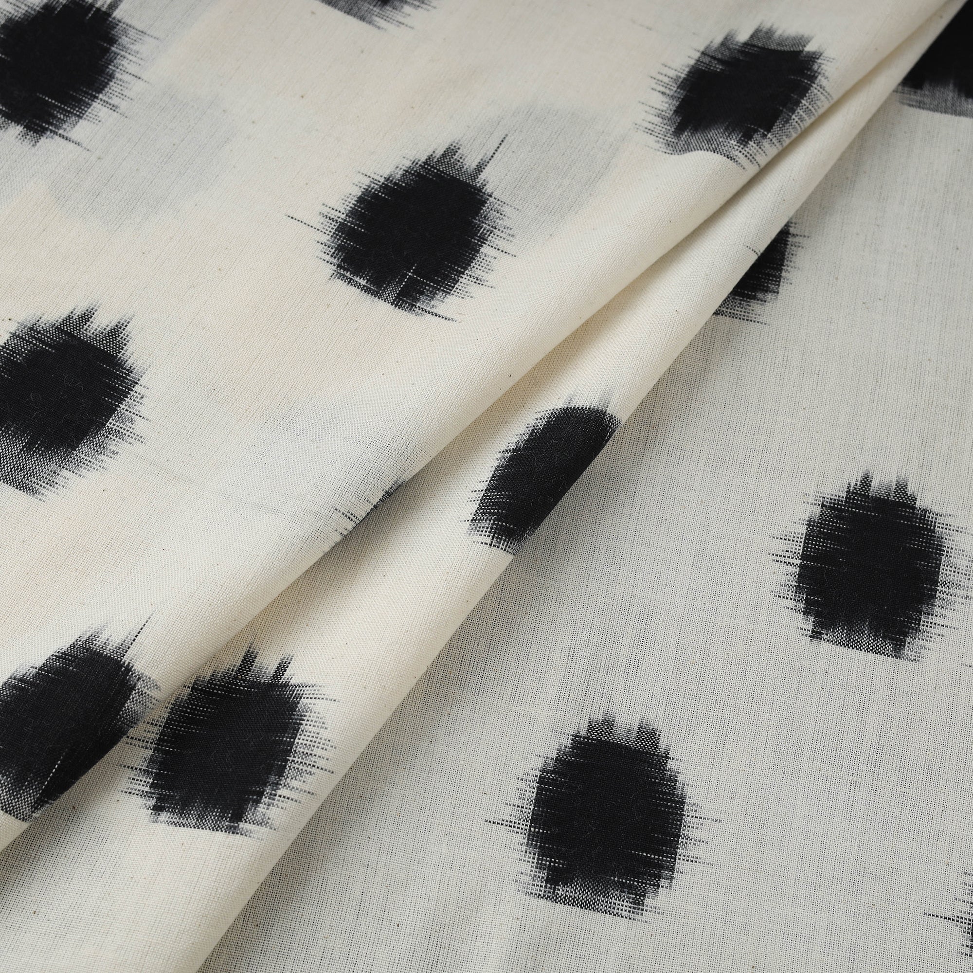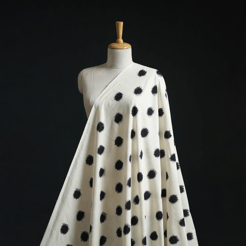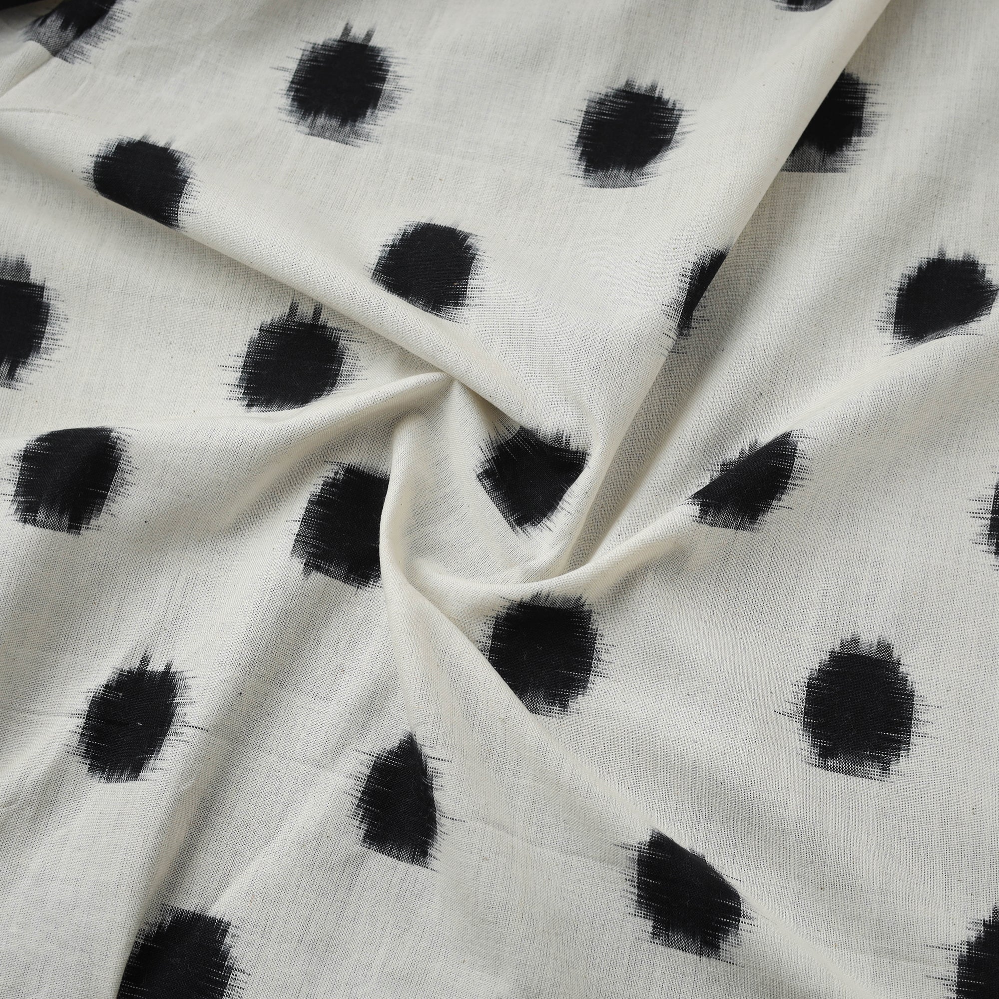 White handloom pochampally double ikat pure cotton fabric from Telangana. Ikat is a unique dyeing technique that is thousands of years old and uses a resist process, similar to tie-dye, applied to either the warp or weft threads before weaving. It features striking patterns and is world-famous for its vibrant colours, distinctive texture, and intricate designs. Ideal for creating kurtas, dresses, tunics or home decor items.