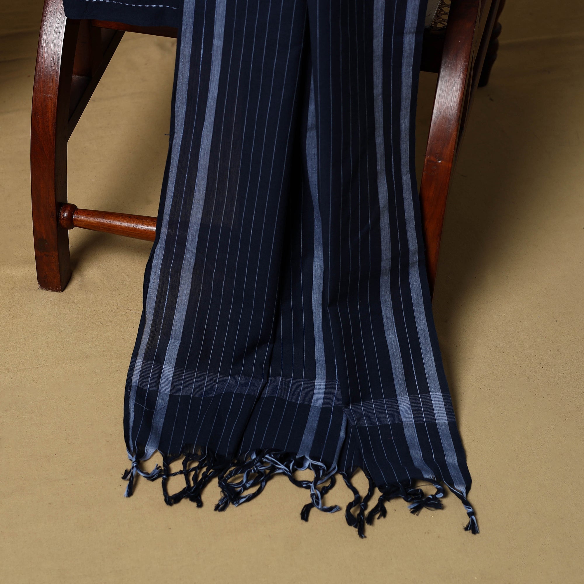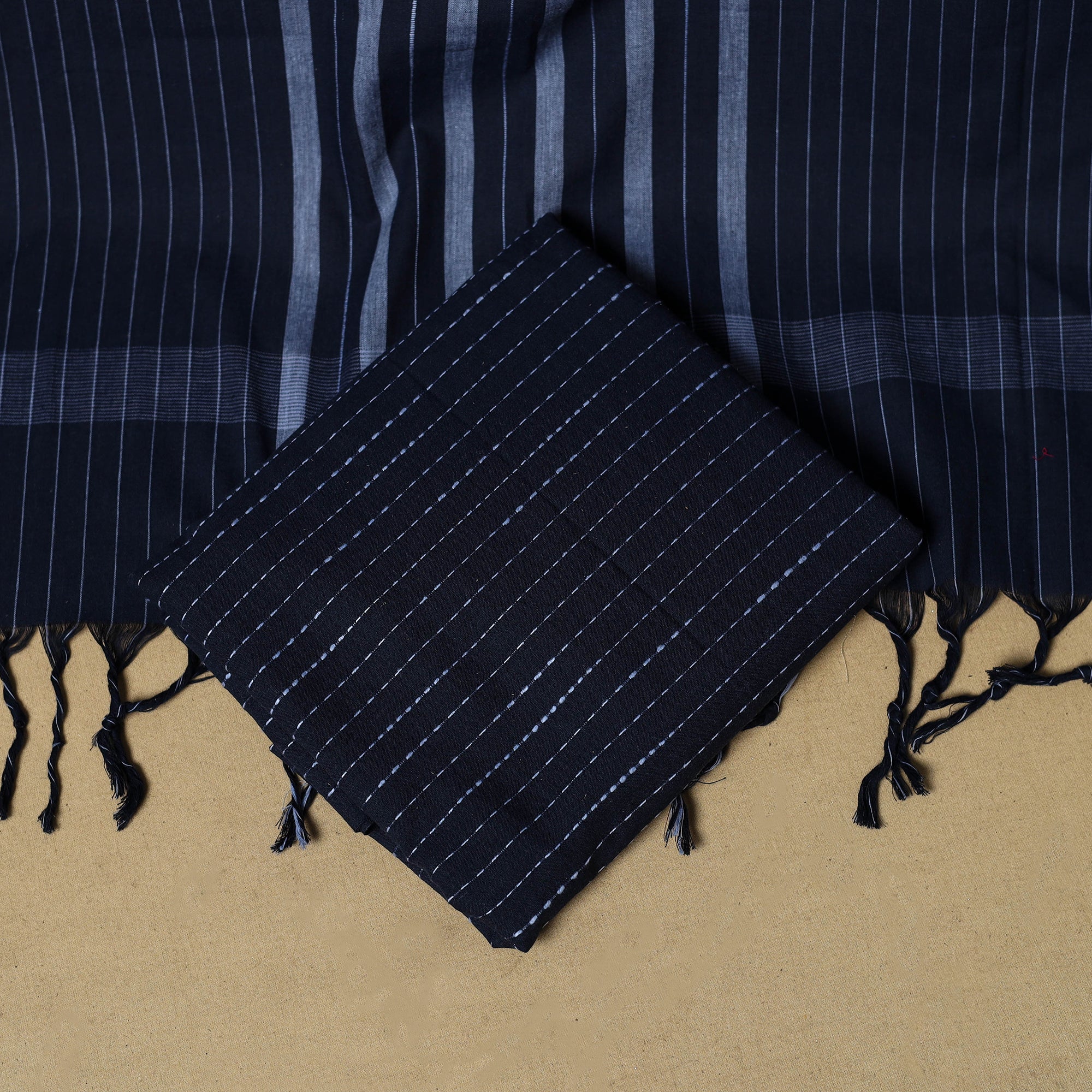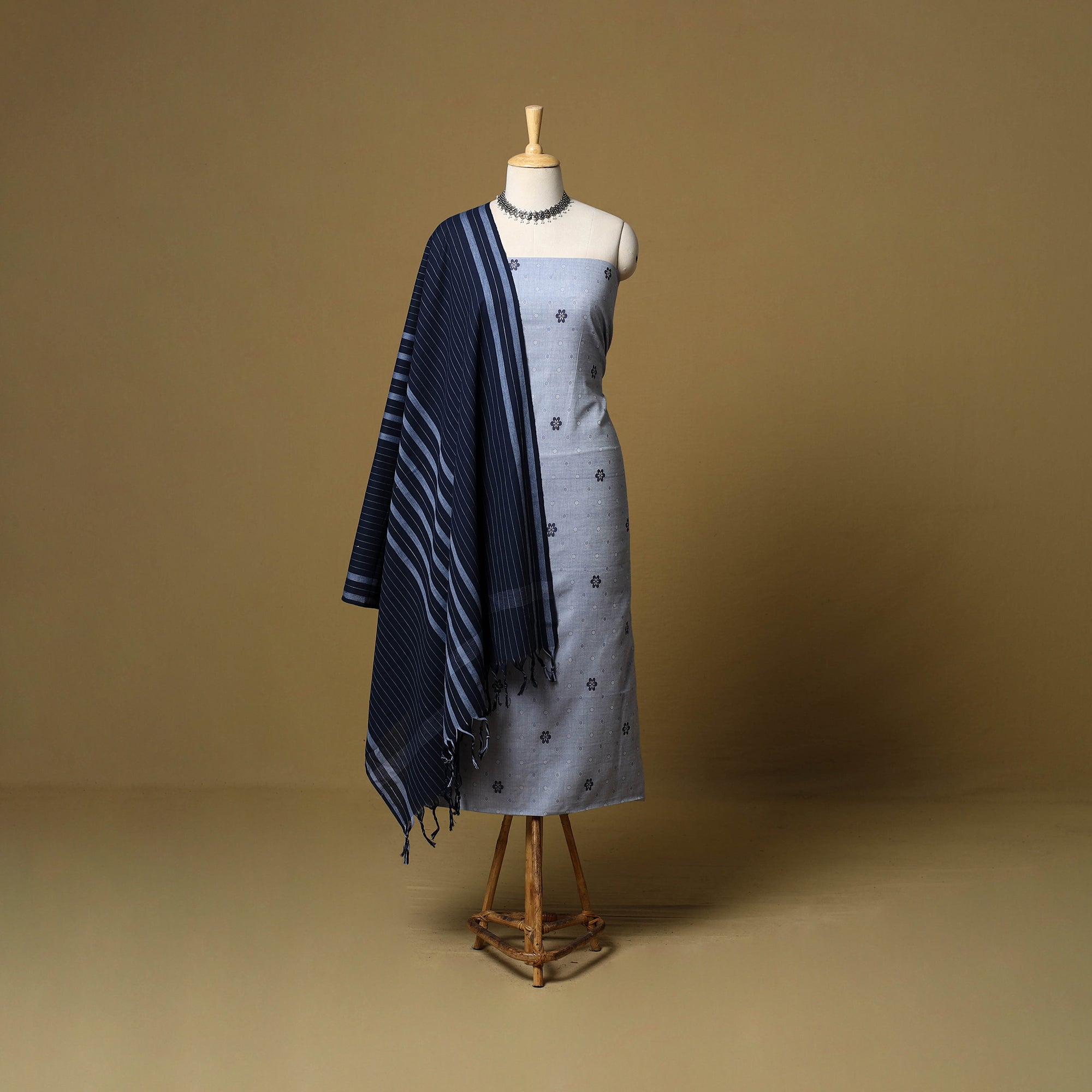 Blue pure cotton dress material is made using the jacquard weaving method, where thread patterns are formed directly on the loom to create a neat, textured design. The set includes jacquard kurta fabric, a plain bottom and a matching dupatta. It is easy to stitch and works well for daily wear, casual outings, small celebrations and family get-togethers.