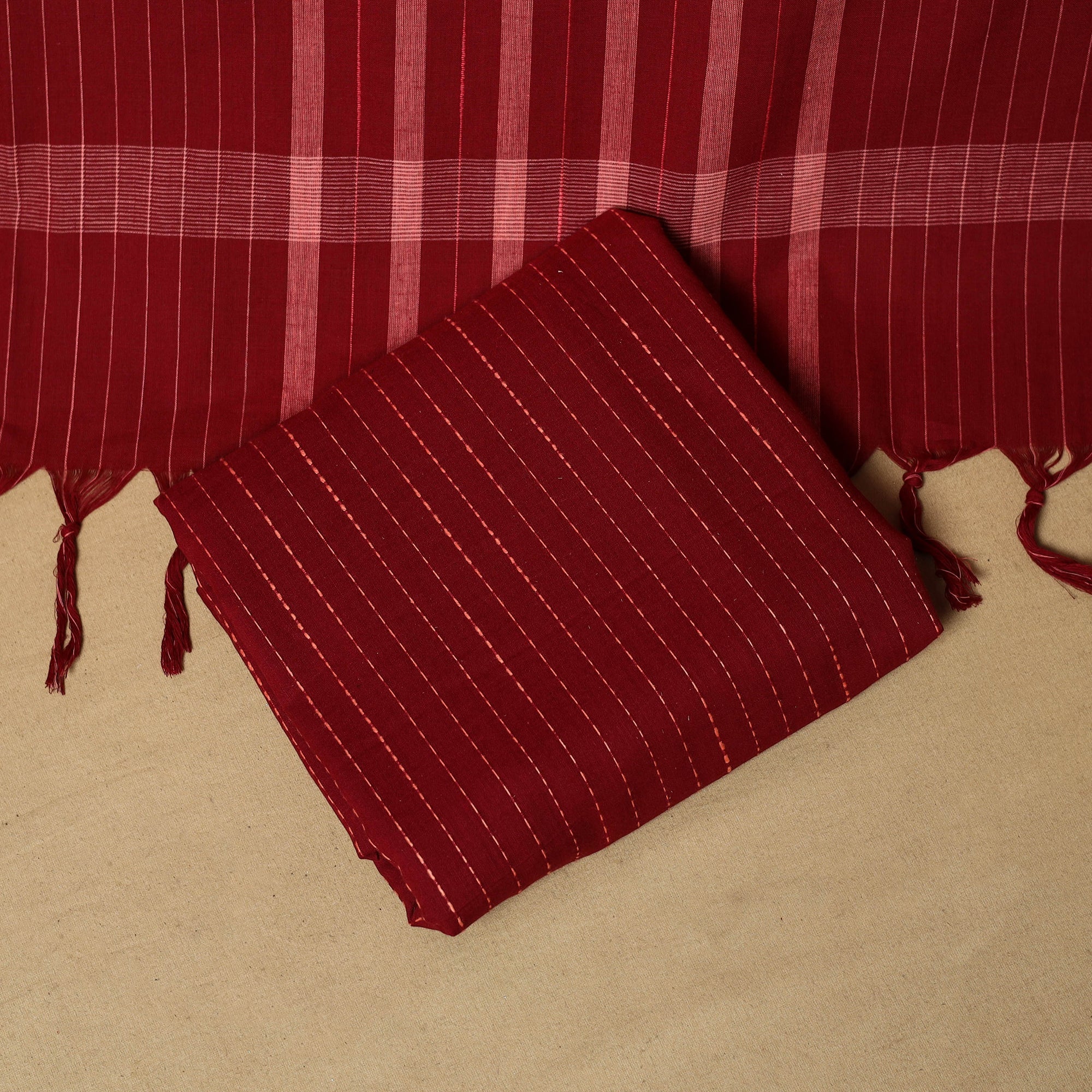 Pink pure cotton dress material is made using the jacquard weaving method, where thread patterns are formed directly on the loom to create a neat, textured design. The set includes jacquard kurta fabric, a plain bottom and a matching dupatta. It is easy to stitch and works well for daily wear, casual outings, small celebrations and family get-togethers.