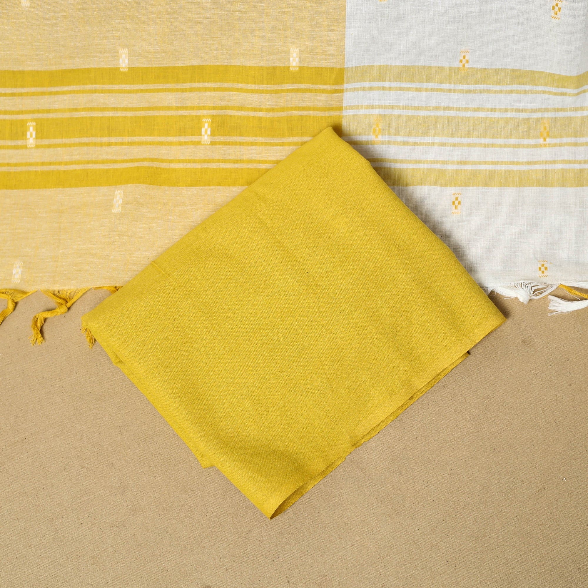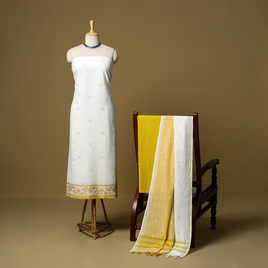 White pure cotton dress material is made using the jacquard weaving method, where thread patterns are formed directly on the loom to create a neat, textured design. The set includes jacquard kurta fabric, a plain bottom and a matching dupatta. It is easy to stitch and works well for daily wear, casual outings, small celebrations and family get-togethers.