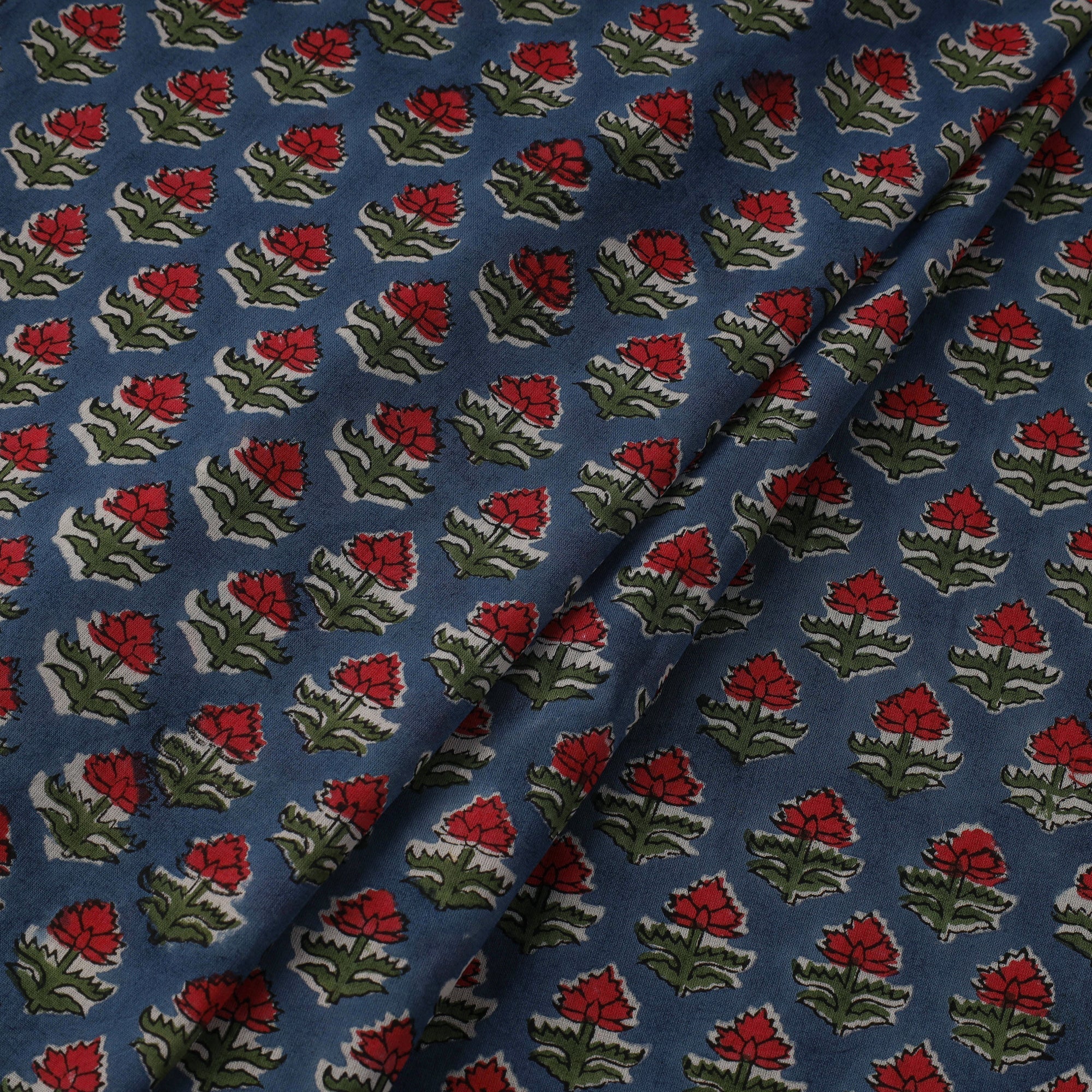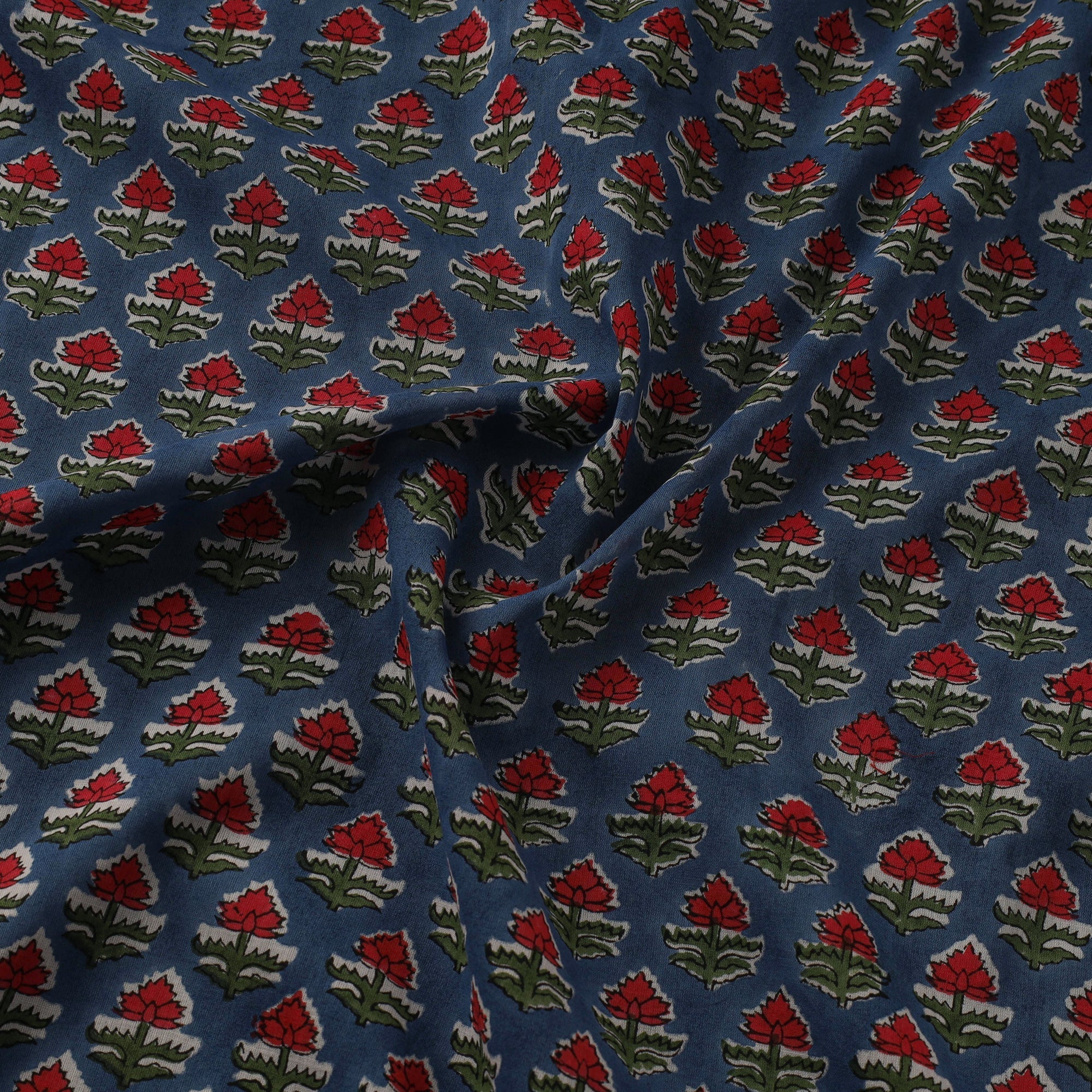 Blue sanganeri hand block print pure mul cotton fabric from Sanganer, Jaipur, Rajasthan by master artisans. This centuries-old printing technique has been practiced for over 500 years and is known for its fine detailing and delicate floral patterns. The designs are printed using traditional hand-carved wooden blocks and bleed-free VAT dyes. The breathable, lightweight mul cotton fabric is ideal for making kurtas, dresses, tunics, as well as home decor items like cushions and curtains.