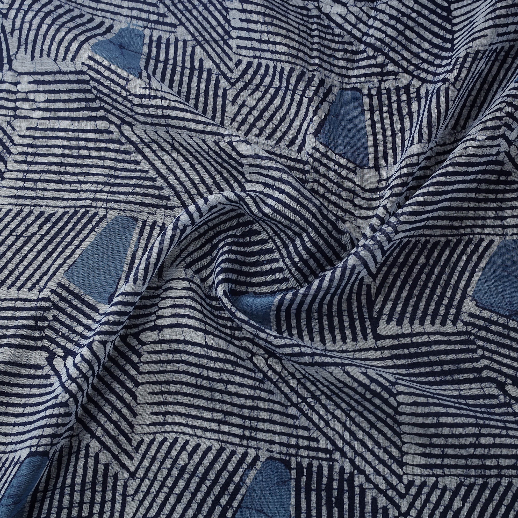 Blue hand block batik print pure mul cotton fabric, crafted by Shakil Ahmed Khatri from Kutch, is created using the traditional wax-resist dyeing technique, believed to be over 2,000 years old. This fabric is perfect for ethnic outfits, relaxed casual wear and creative home decor ideas.
