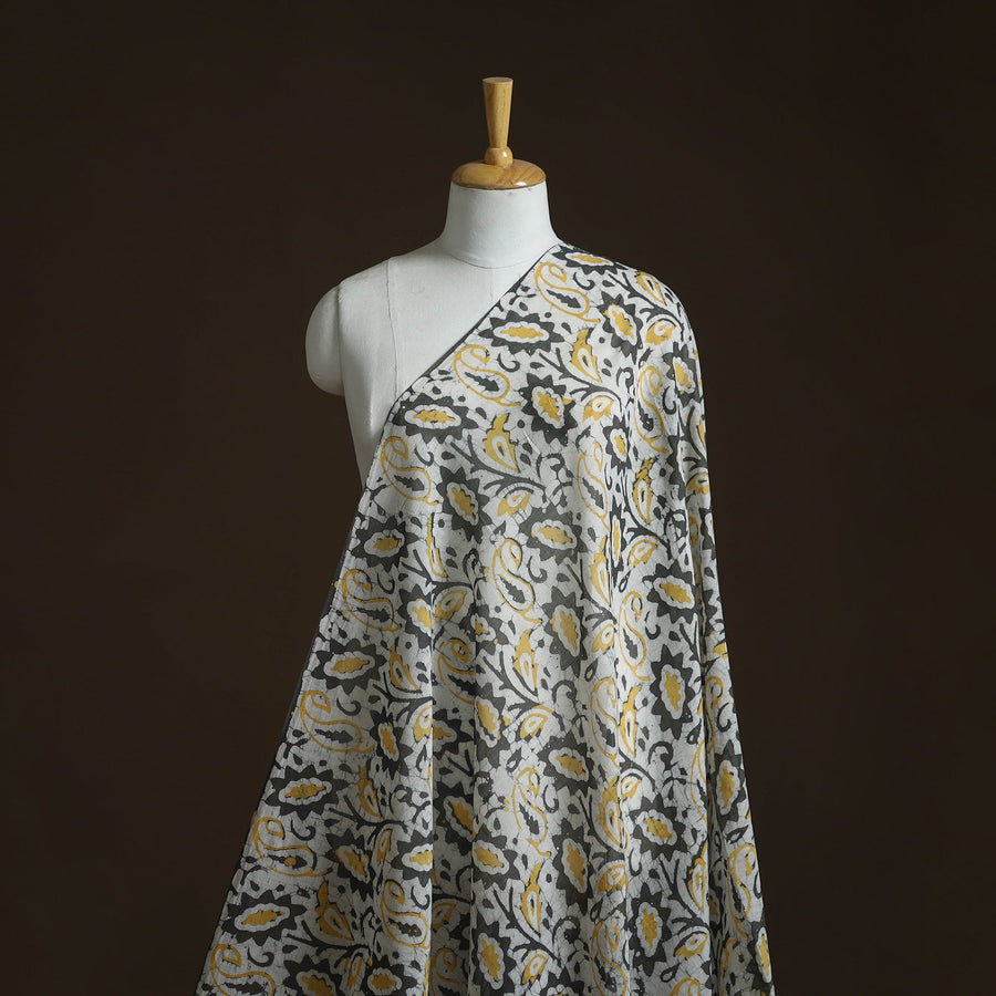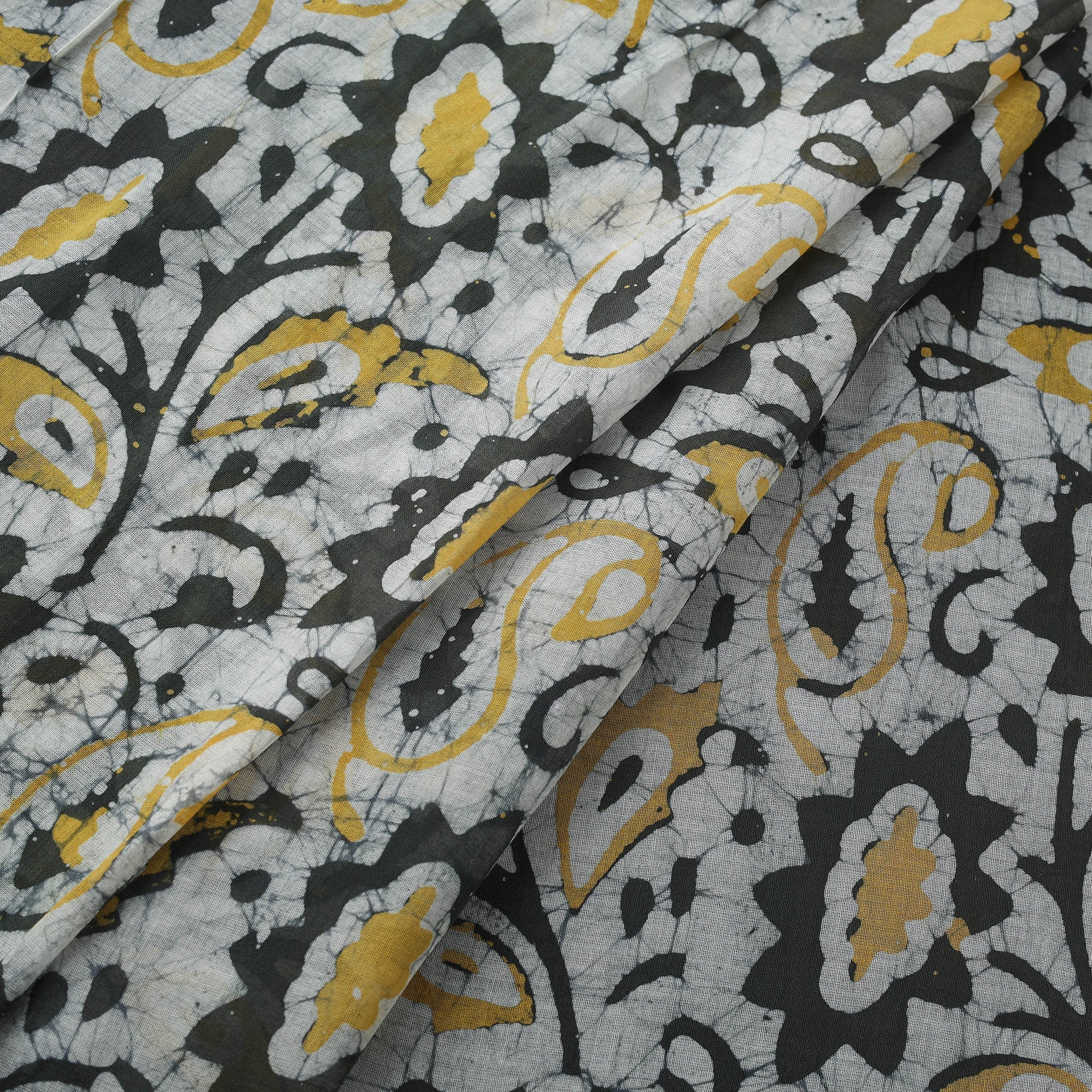 Grey hand block batik print fabric, crafted by skilled artisans from Kutch, is made using the traditional wax-resist dyeing technique, believed to be over 2,000 years old. Made from breathable pure mul cotton, it feels light on the skin and has a smooth texture. Easy to stitch and style, this versatile fabric drapes gracefully and is ideal for ethnic outfits, relaxed casual wear and creative home decor ideas.