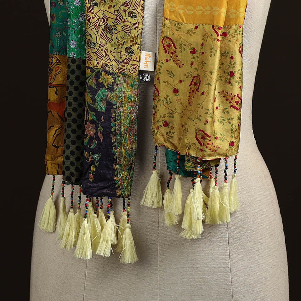 100% pure silk stole with tassels by Tiara Moon, it features patchwork designs created using azo-free dyes and pieces of screen-printed fabric, giving it a unique and artistic look. Lightweight and versatile, it pairs beautifully with kurtas, dresses, tunics or even casual tops for an elegant touch.