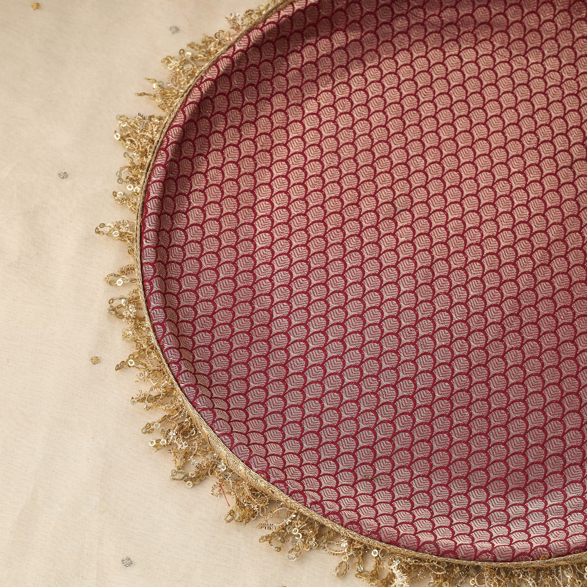 This banarasi Karwa chauth thali set is a must-have for festive celebrations. Crafted from sturdy stainless steel, it is elegantly wrapped in rich banarasi fabric and adorned with delicate mirror and bead detailing. The refined design adds charm to rituals while ensuring durability and long-lasting use. Ideal for karwa chauth pooja, this beautiful thali set enriches the traditional ambience and completes your festive look with elegance.
