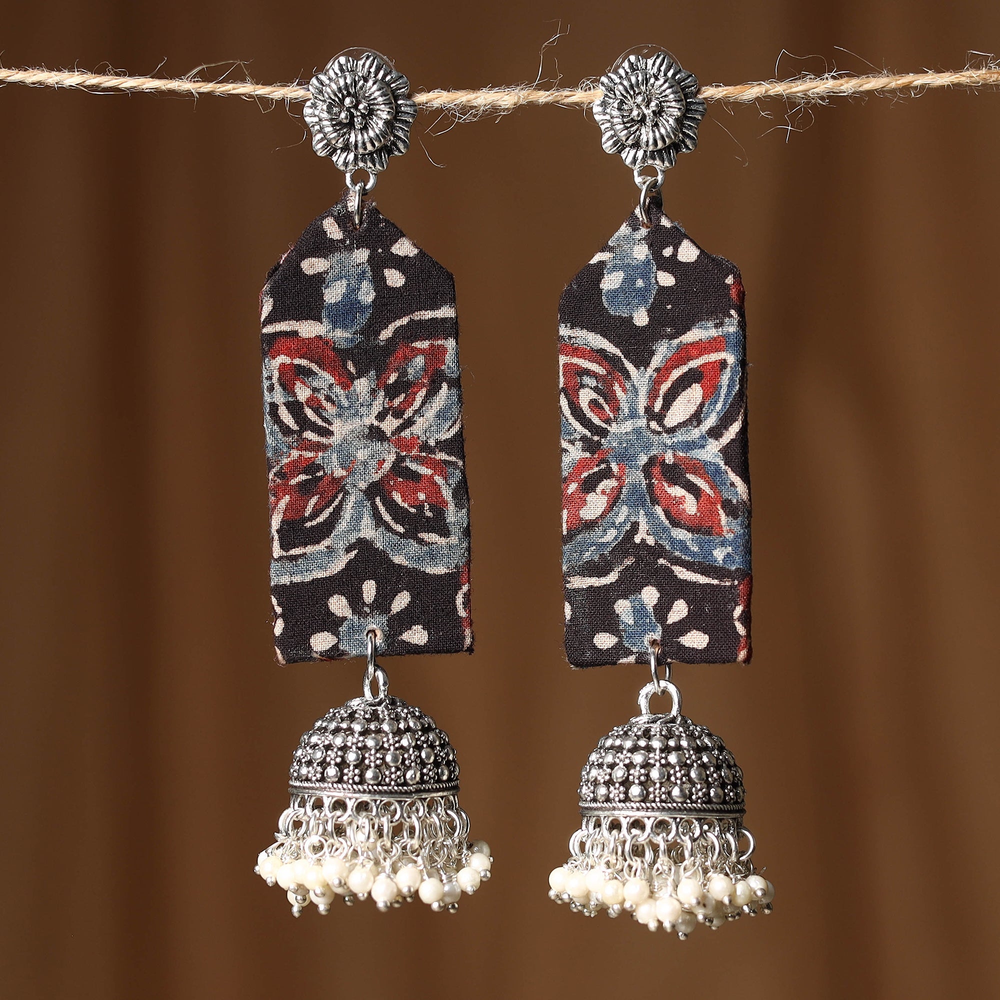 Add a unique flair to your outfit with these black handmade fabric earrings. A German silver jhumki is attached at the end, adorned with beads that enhance its charm. Perfect for everyday wear or special occasions, these earrings blend traditional style with a playful touch.