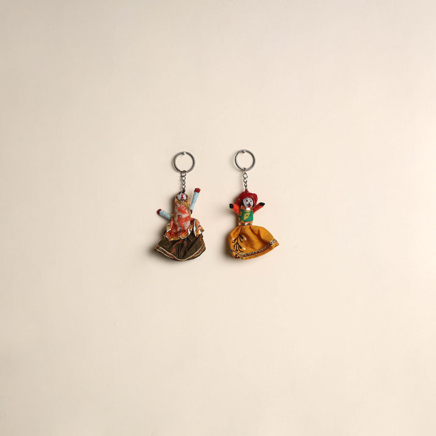 Multicolor Rajasthani puppet couple handmade keychain set. Crafted from fabric and adorned with intricate gota patti these keychains add a touch of Rajasthan's cultural richness to your daily essentials. Not only do they keep your keys organized but they also serve as charming miniature pieces of art that make for a unique and eye catching accessory.