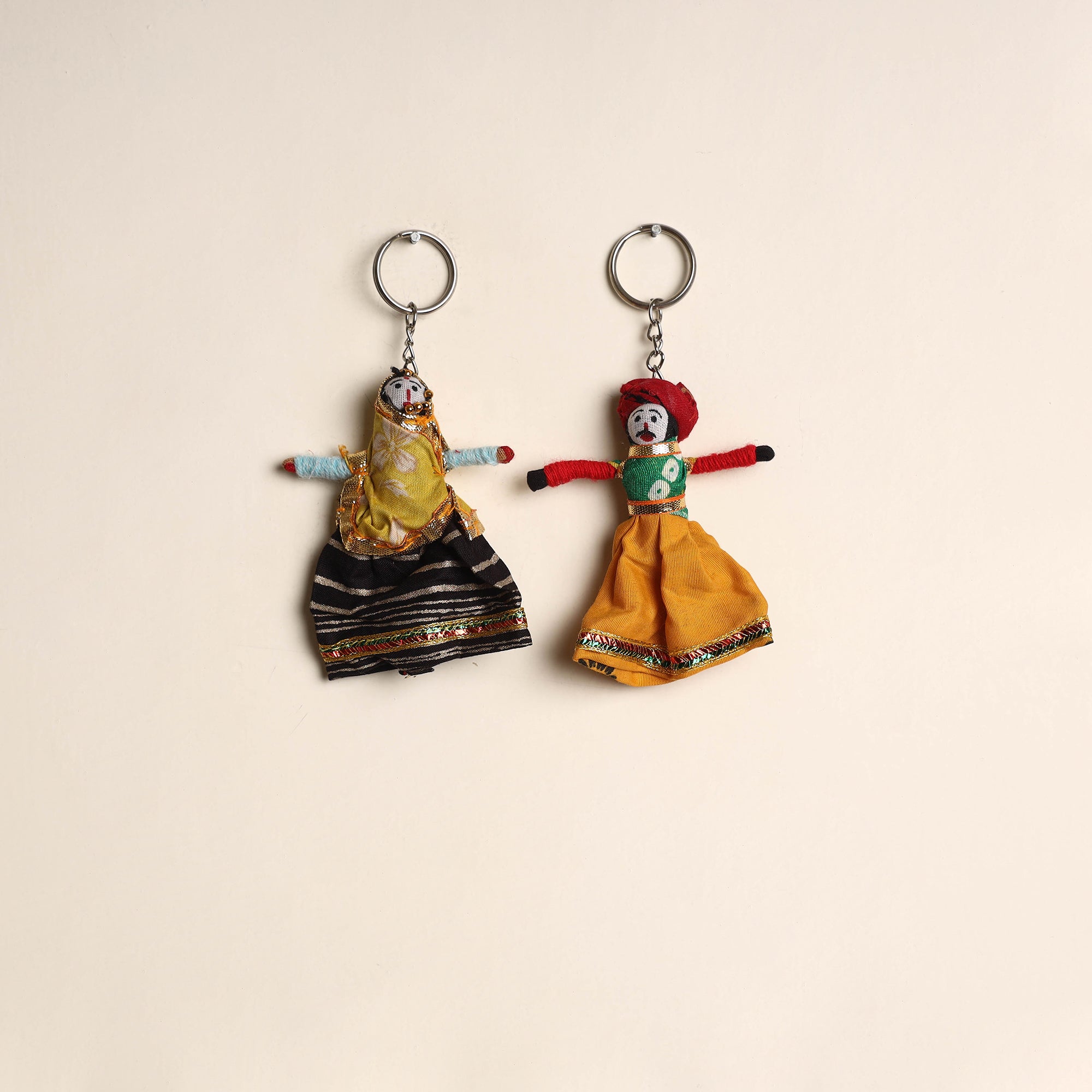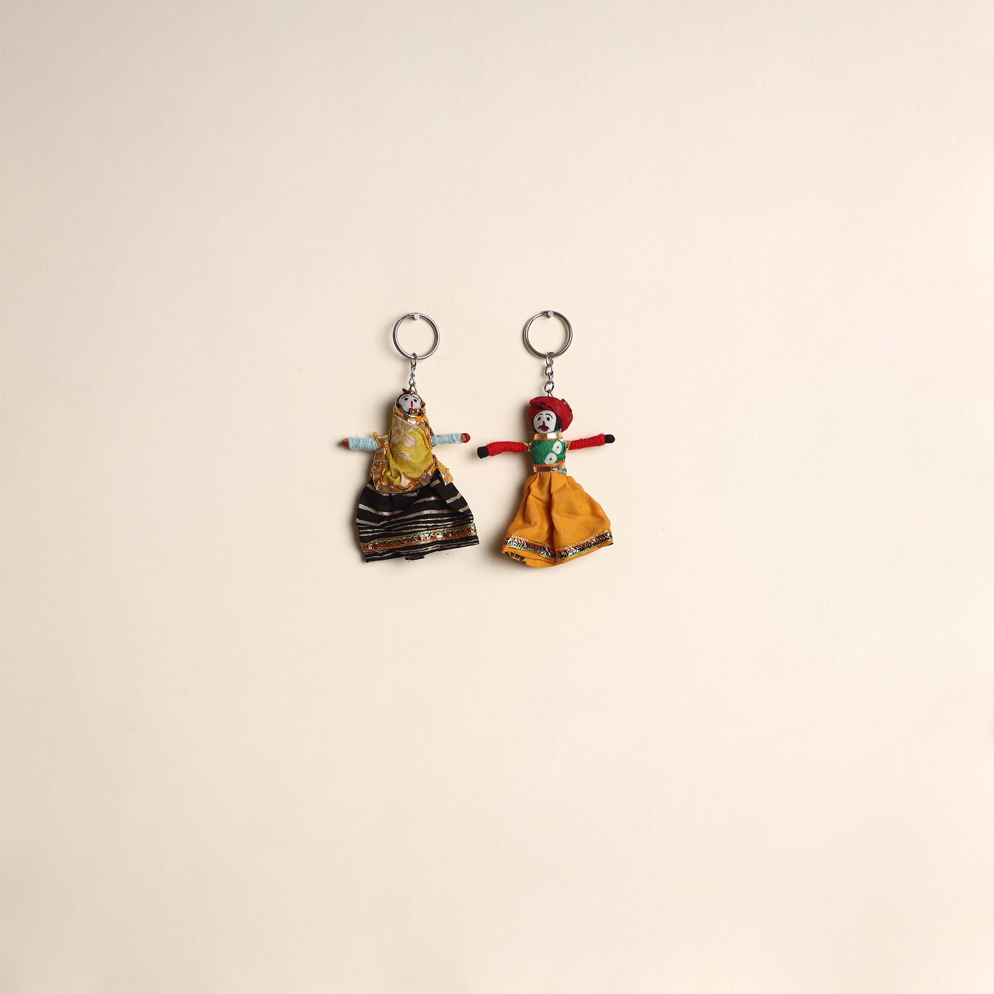 Multicolor Rajasthani puppet couple handmade keychain set. Crafted from fabric and adorned with intricate gota patti these keychains add a touch of Rajasthan's cultural richness to your daily essentials. Not only do they keep your keys organized but they also serve as charming miniature pieces of art that make for a unique and eye catching accessory.