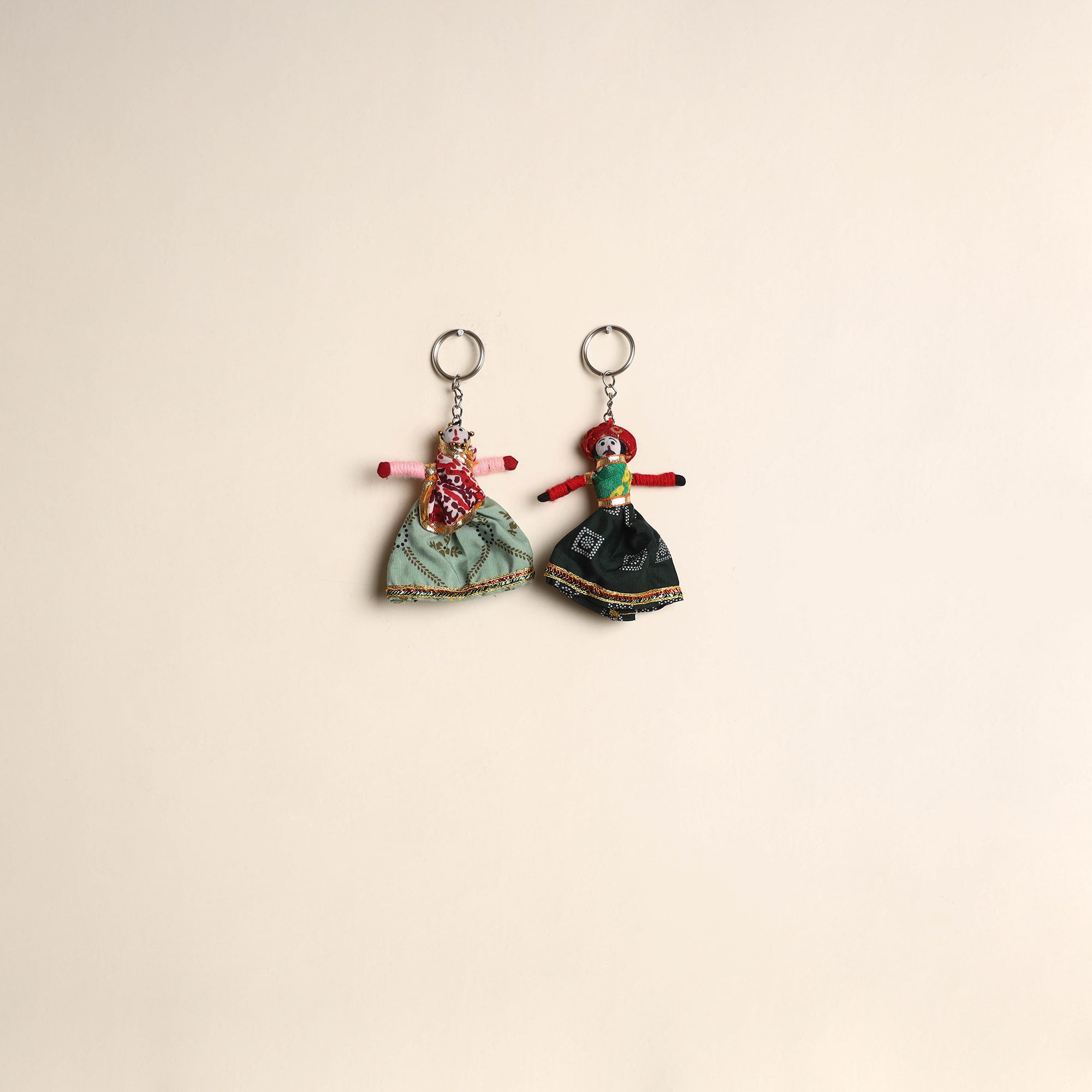 | Material | Multicolor Rajasthani puppet couple handmade keychain set. Crafted from fabric and adorned with intricate gota patti these keychains add a touch of Rajasthan's cultural richness to your daily essentials. Not only do they keep your keys organized but they also serve as charming miniature pieces of art that make for a unique and eye catching accessory. |