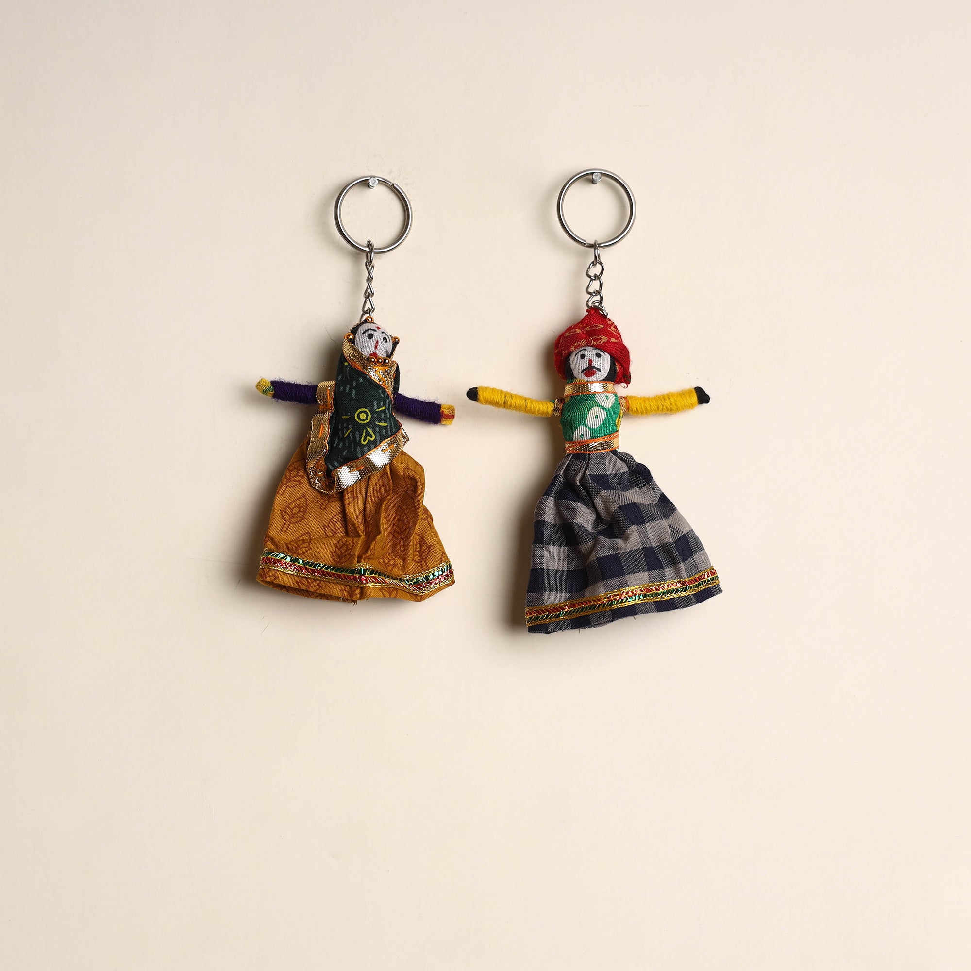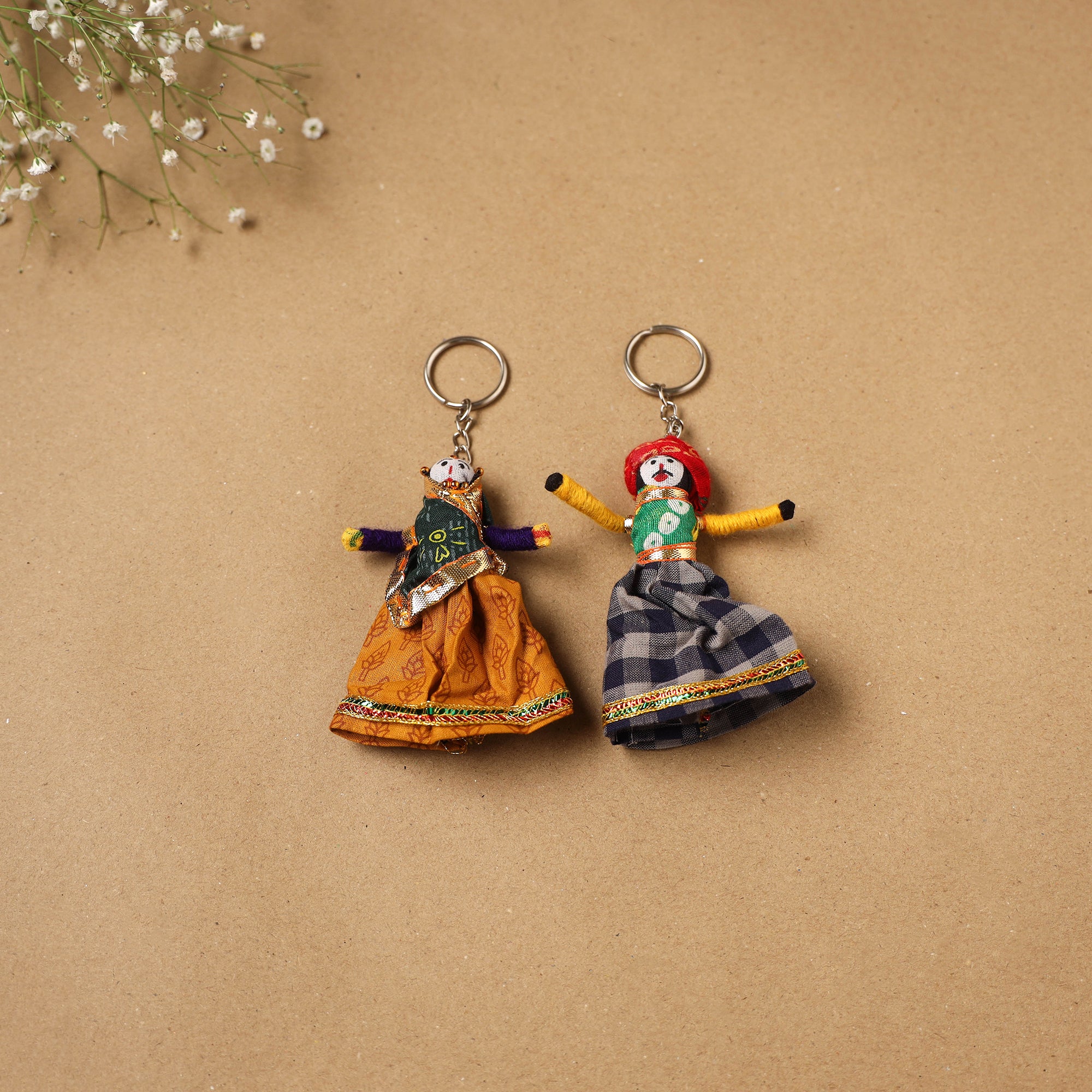 Multicolor Rajasthani puppet couple handmade keychain set. Crafted from fabric and adorned with intricate gota patti these keychains add a touch of Rajasthan's cultural richness to your daily essentials. Not only do they keep your keys organized but they also serve as charming miniature pieces of art that make for a unique and eye catching accessory.