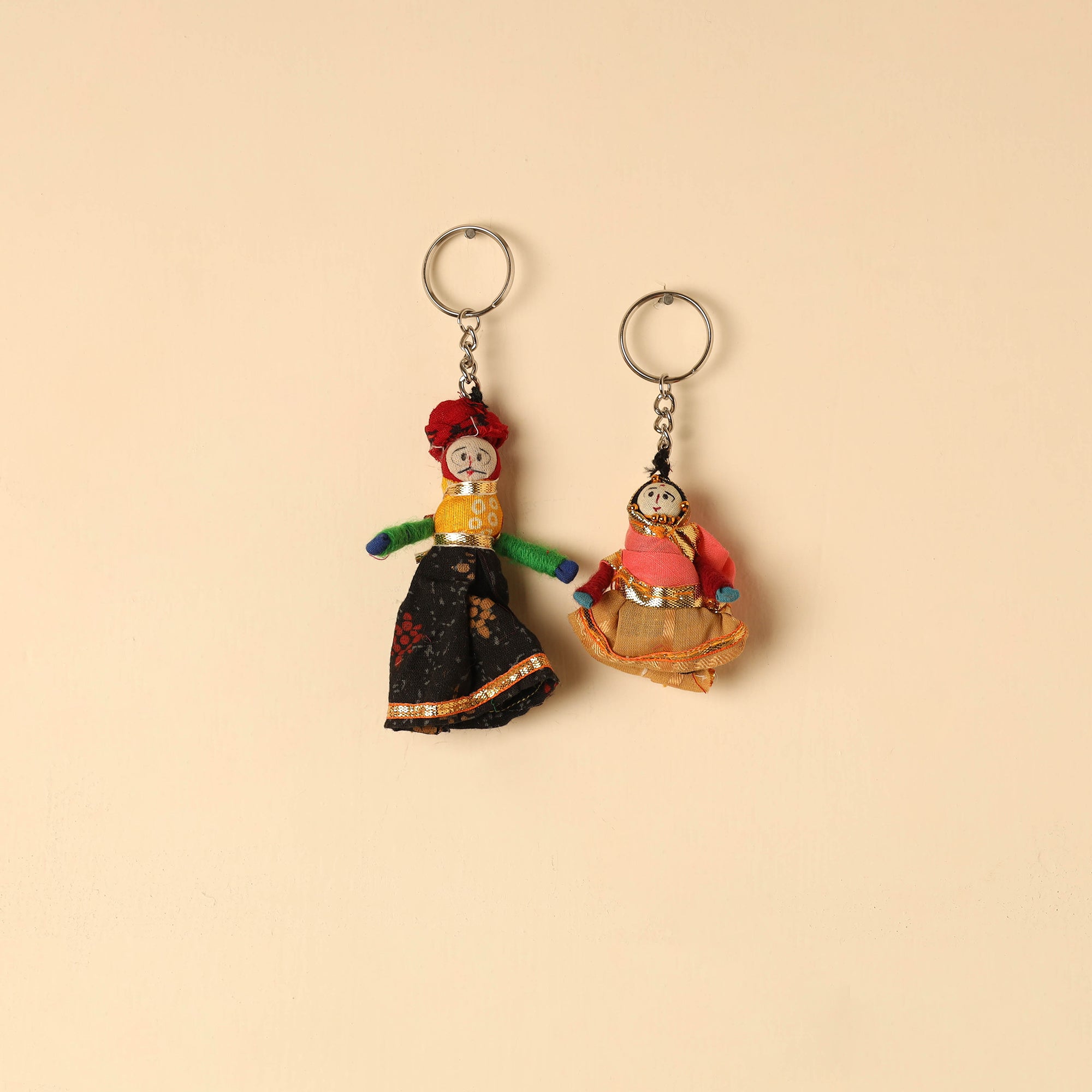 Bring a touch of tradition to your everyday essentials with multicolor rajasthani puppet couple handmade keychain set. Crafted from fabric and adorned with intricate gota patti work, these keychains add a touch of Rajasthan's cultural richness to your daily essentials. Not only do they keep your keys organized, but they also serve as charming, miniature pieces of art that make for a unique and eye-catching accessory.