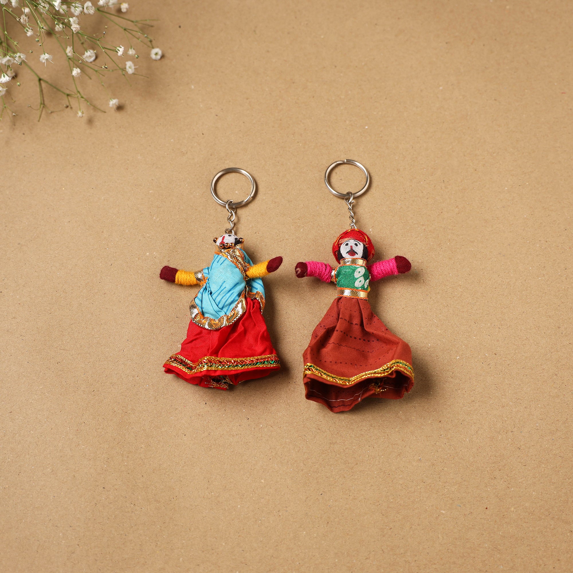 Multicolor Rajasthani puppet couple handmade keychain set. Crafted from fabric and adorned with intricate gota patti these keychains add a touch of Rajasthan's cultural richness to your daily essentials. Not only do they keep your keys organized but they also serve as charming miniature pieces of art that make for a unique and eye catching accessory.