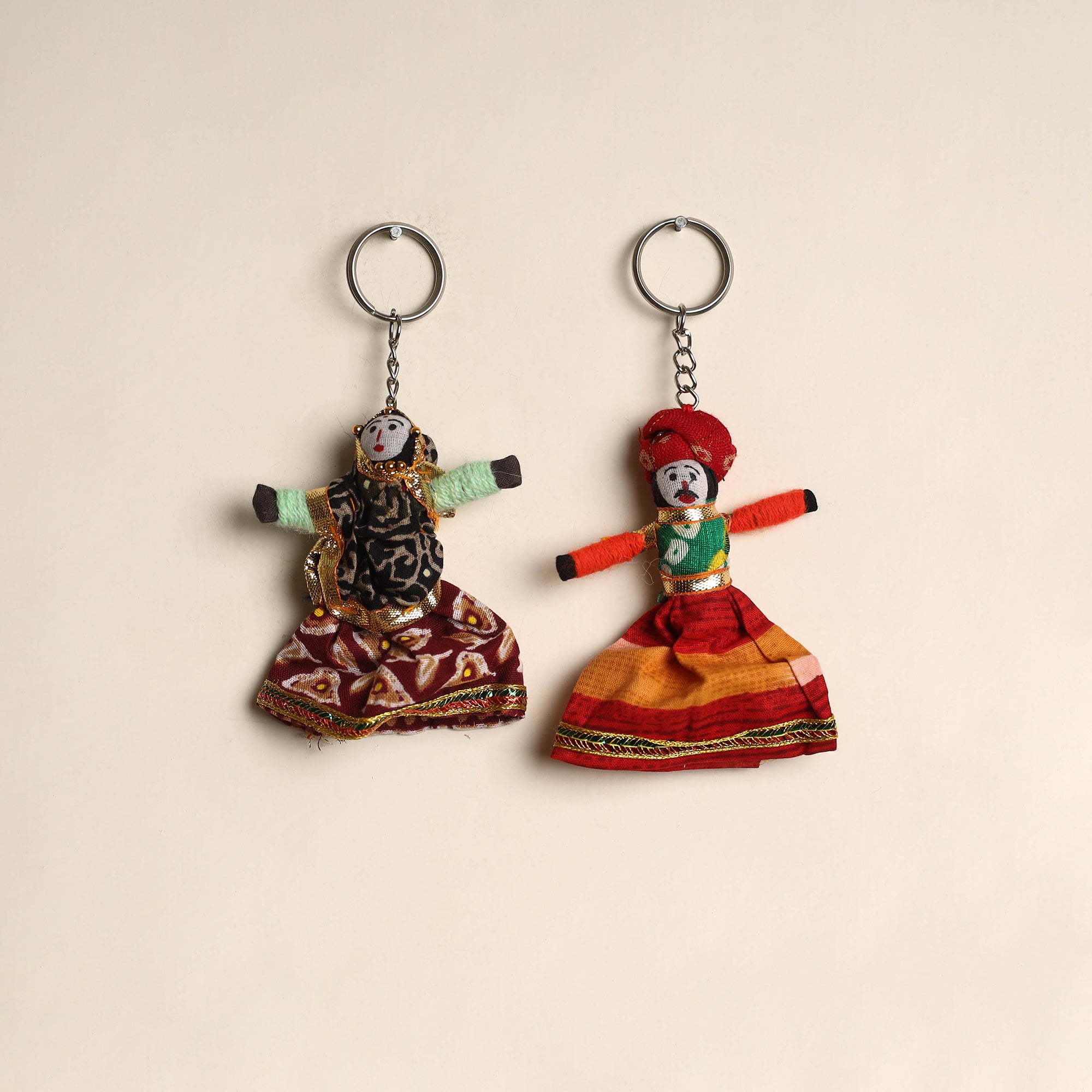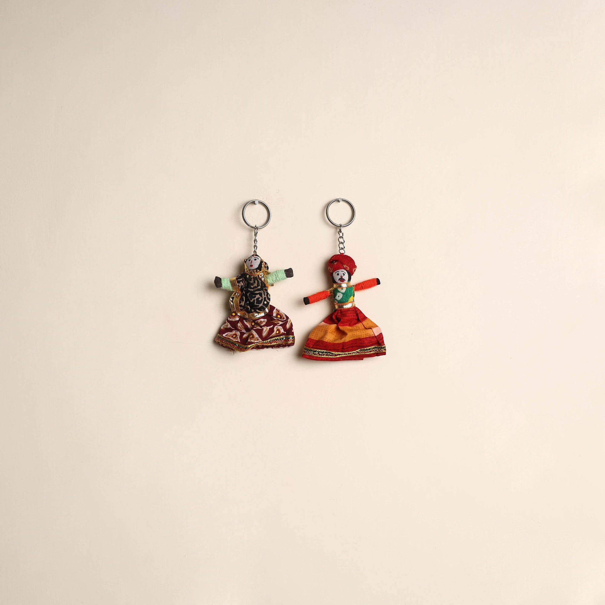 Multicolor Rajasthani puppet couple handmade keychain set. Crafted from fabric and adorned with intricate gota patti these keychains add a touch of Rajasthan's cultural richness to your daily essentials. Not only do they keep your keys organized but they also serve as charming miniature pieces of art that make for a unique and eye catching accessory.