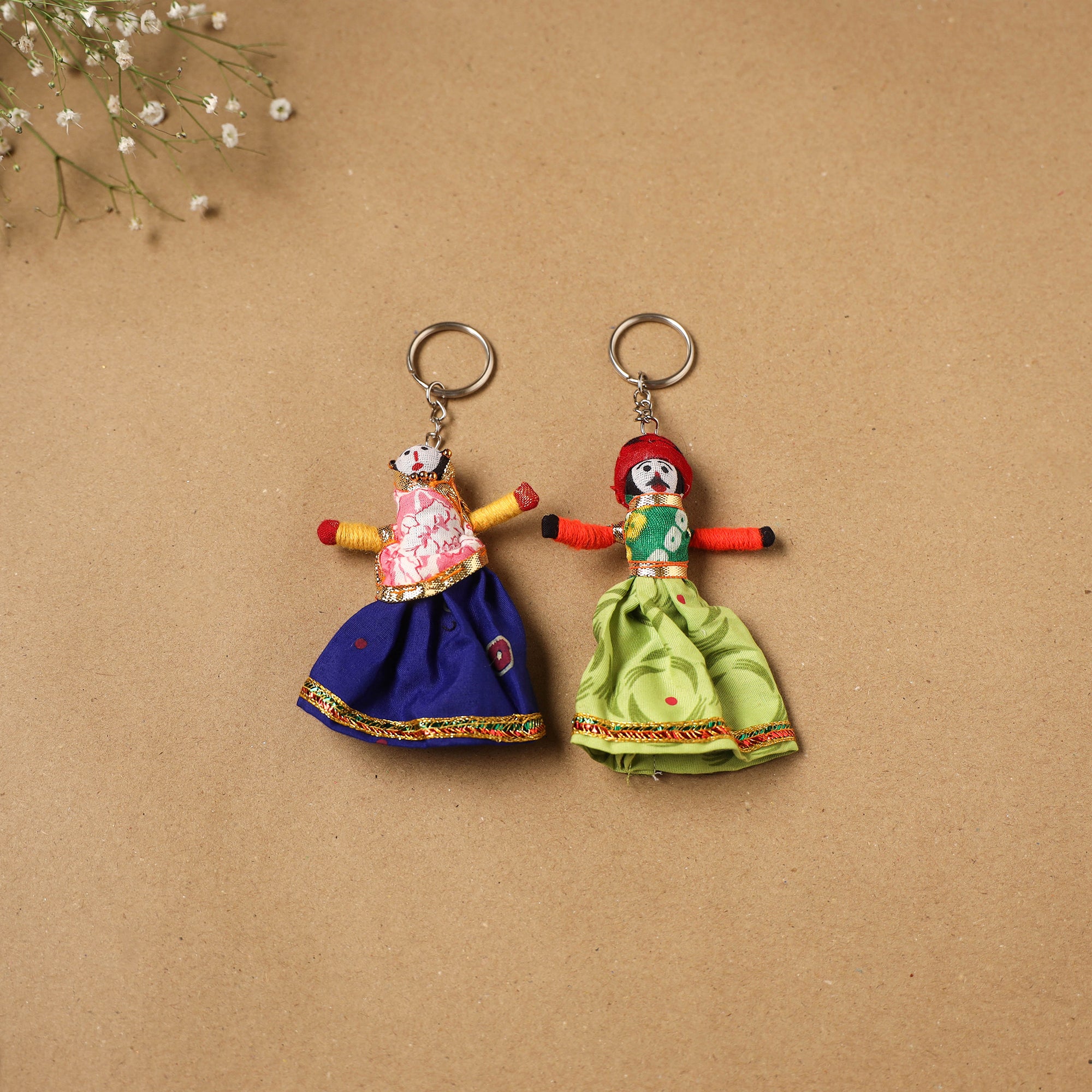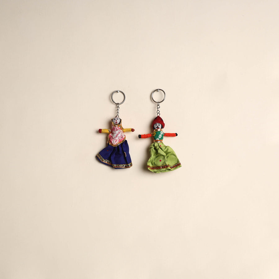 Multicolor Rajasthani puppet couple handmade keychain set. Crafted from fabric and adorned with intricate gota patti these keychains add a touch of Rajasthan's cultural richness to your daily essentials. Not only do they keep your keys organized but they also serve as charming miniature pieces of art that make for a unique and eye catching accessory.