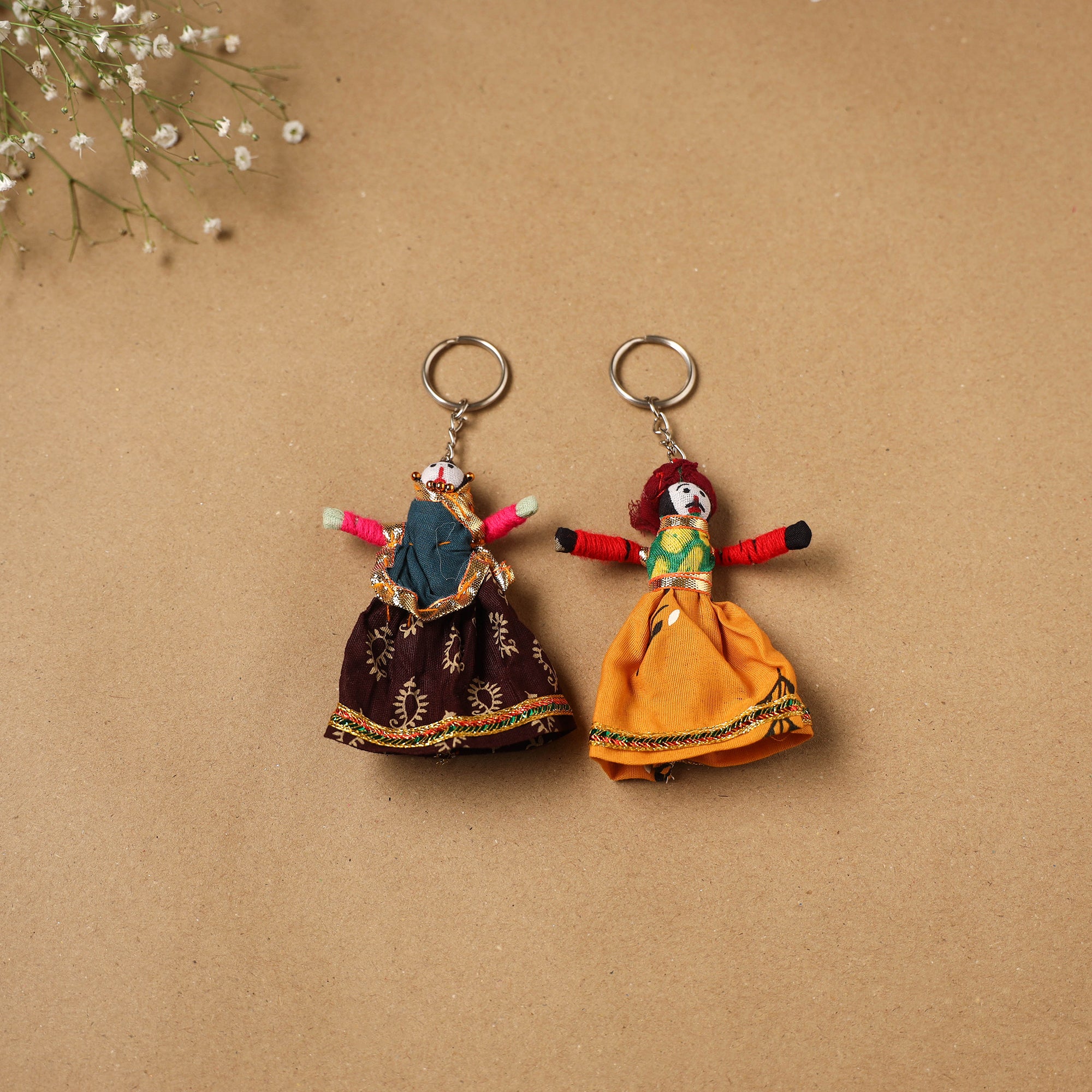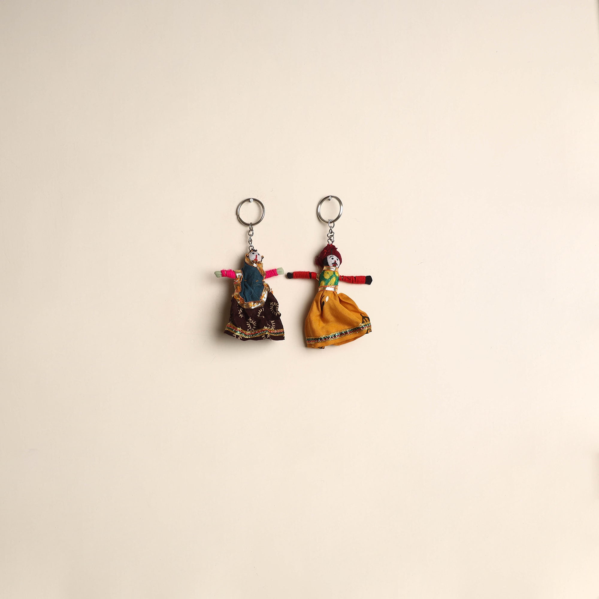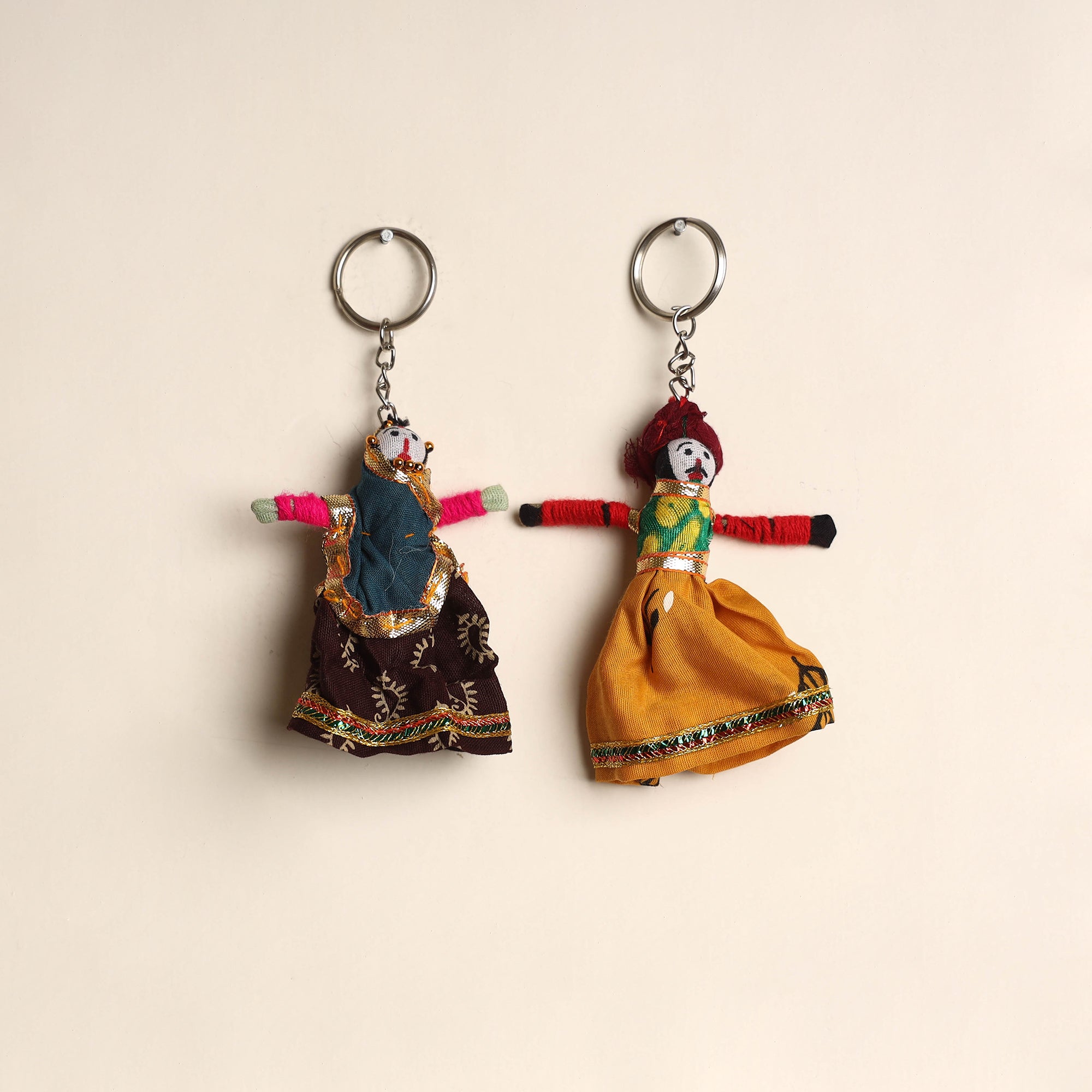 Multicolor Rajasthani puppet couple handmade keychain set. Crafted from fabric and adorned with intricate gota patti these keychains add a touch of Rajasthan's cultural richness to your daily essentials. Not only do they keep your keys organized but they also serve as charming miniature pieces of art that make for a unique and eye catching accessory.
