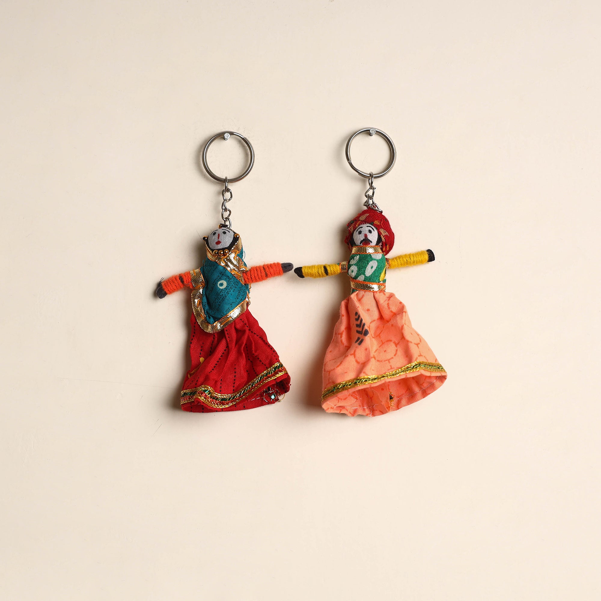 Multicolor Rajasthani puppet couple handmade keychain set. Crafted from fabric and adorned with intricate gota patti these keychains add a touch of Rajasthan's cultural richness to your daily essentials. Not only do they keep your keys organized but they also serve as charming miniature pieces of art that make for a unique and eye catching accessory.