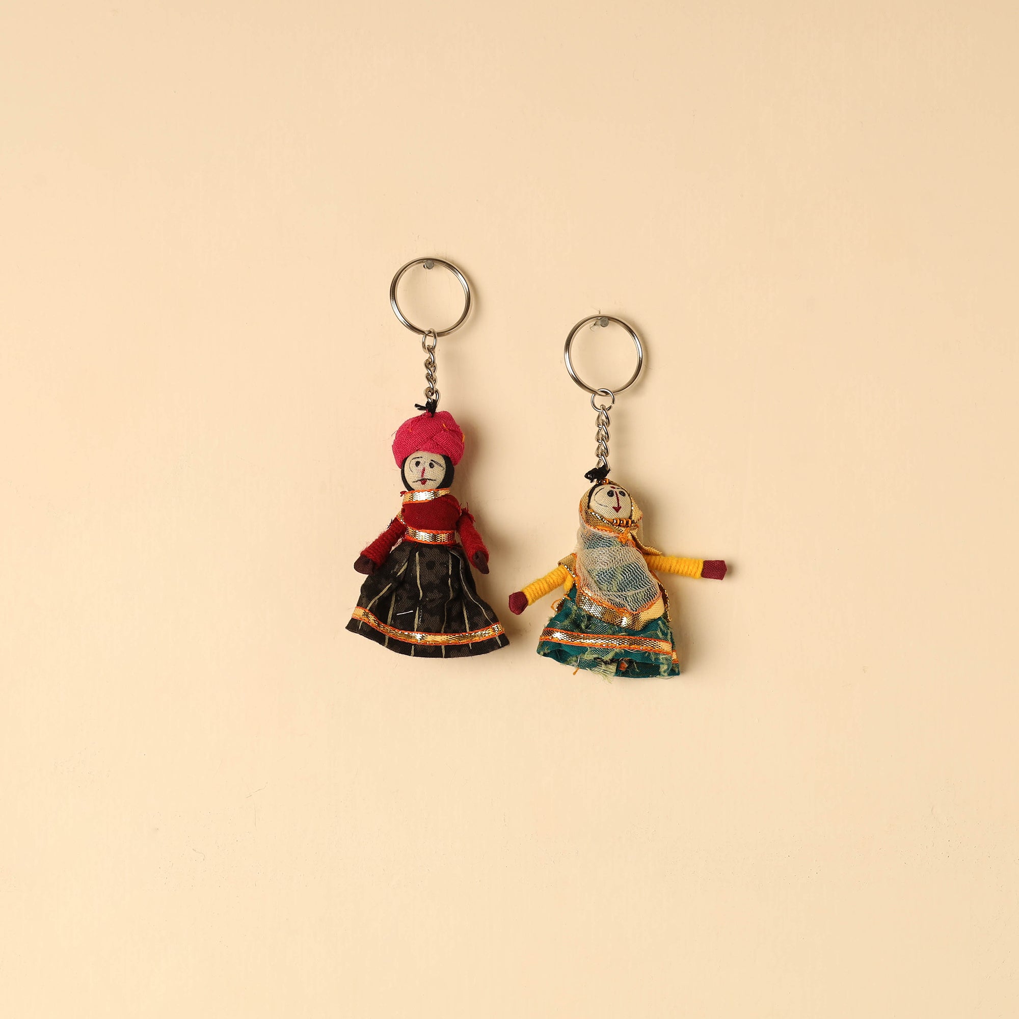 | Material | Bring a touch of tradition to your everyday essentials with multicolor rajasthani puppet couple handmade keychain set. Crafted from fabric and adorned with intricate gota patti work, these keychains add a touch of Rajasthan's cultural richness to your daily essentials. Not only do they keep your keys organized, but they also serve as charming, miniature pieces of art that make for a unique and eye-catching accessory. |