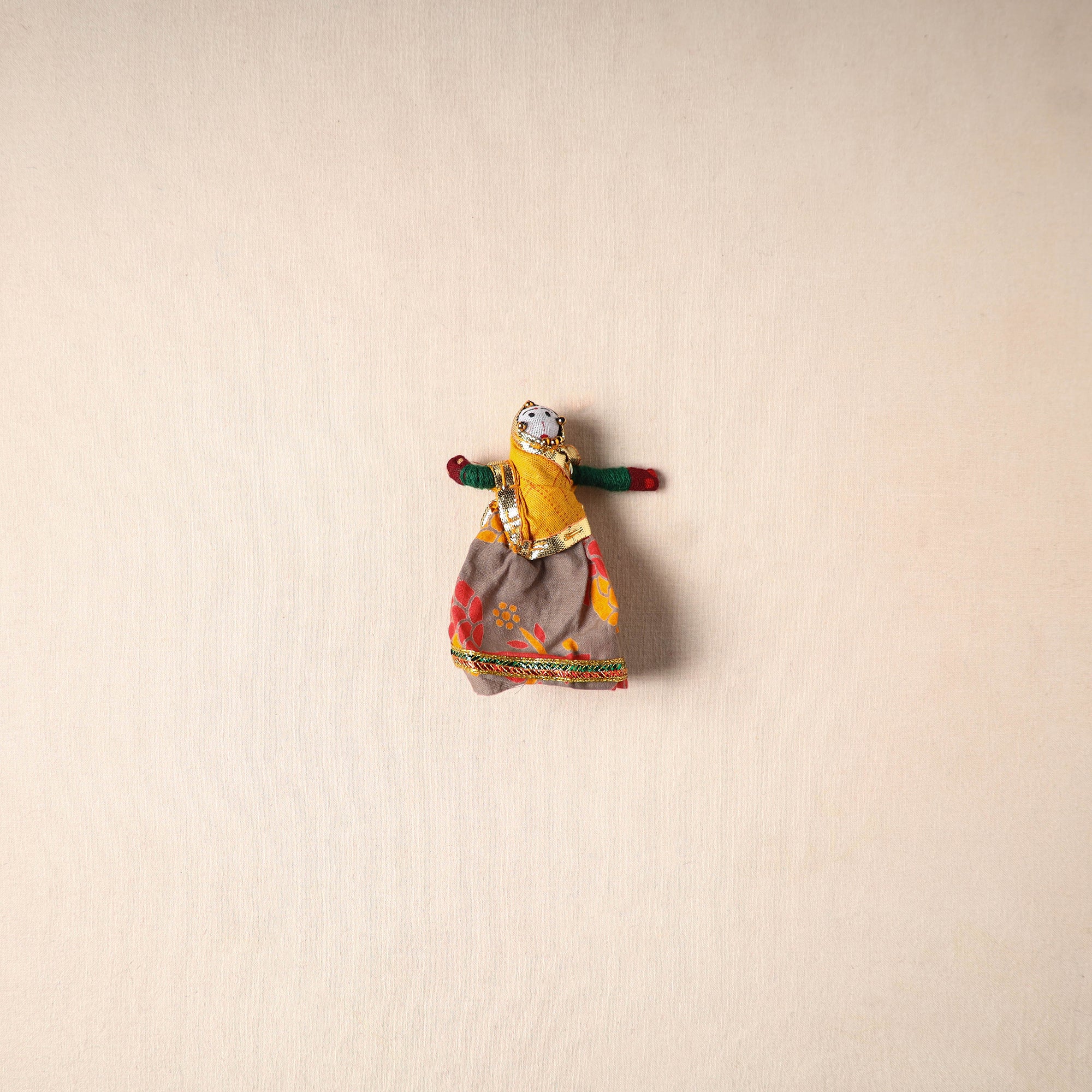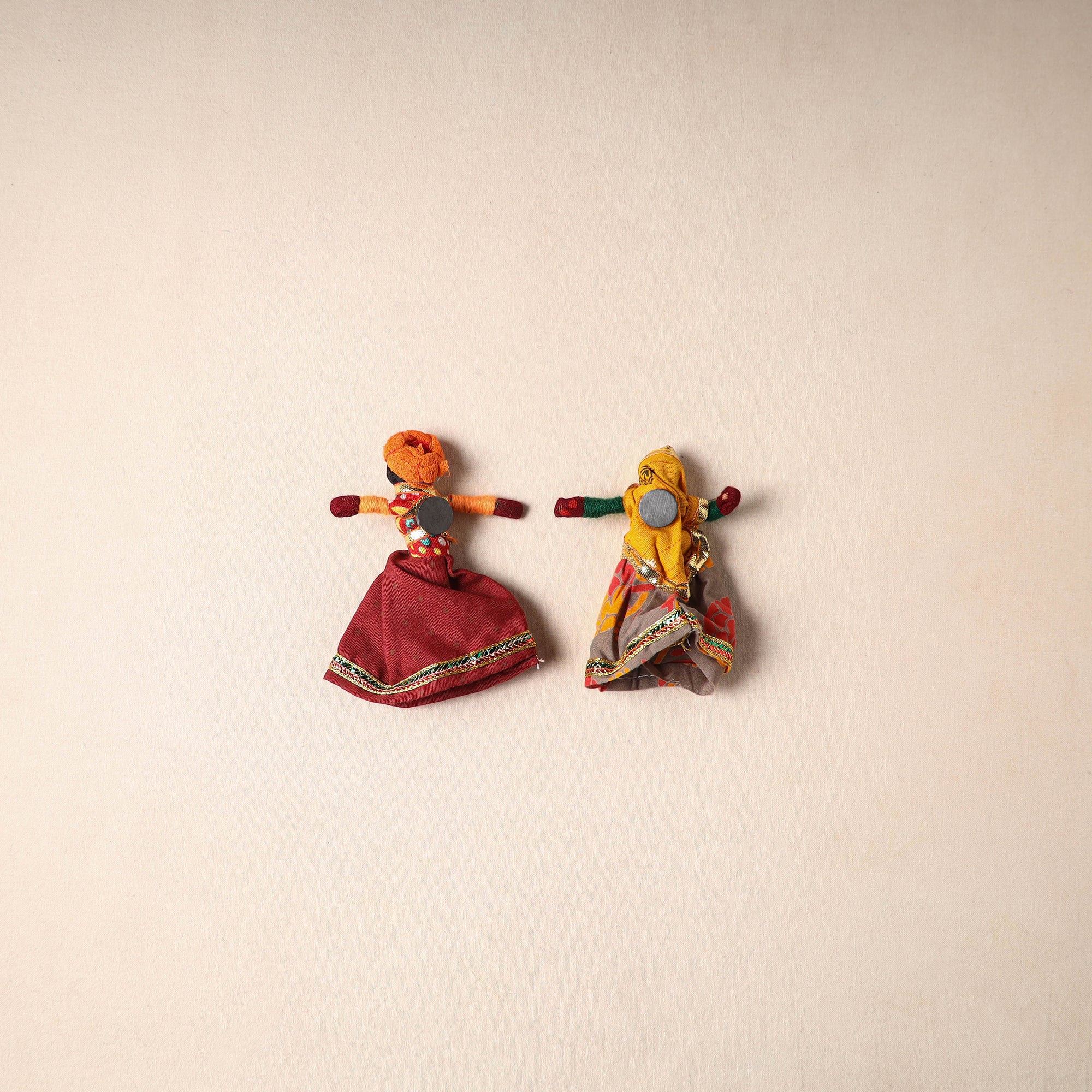 Multicolor Rajasthani puppet couple magnets (set of 2), handcrafted by skilled artisans. Made from vibrant fabric and adorned with gota patti work, these magnets can be placed on your fridge, workstation or magnetic board to bring a unique blend of tradition and cultural charm to your space.