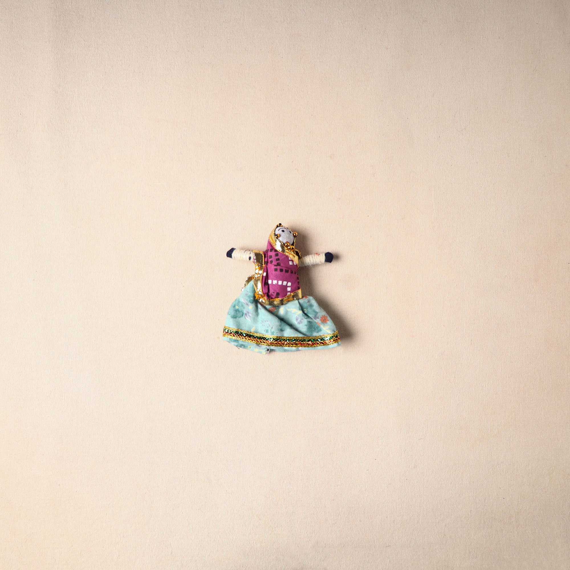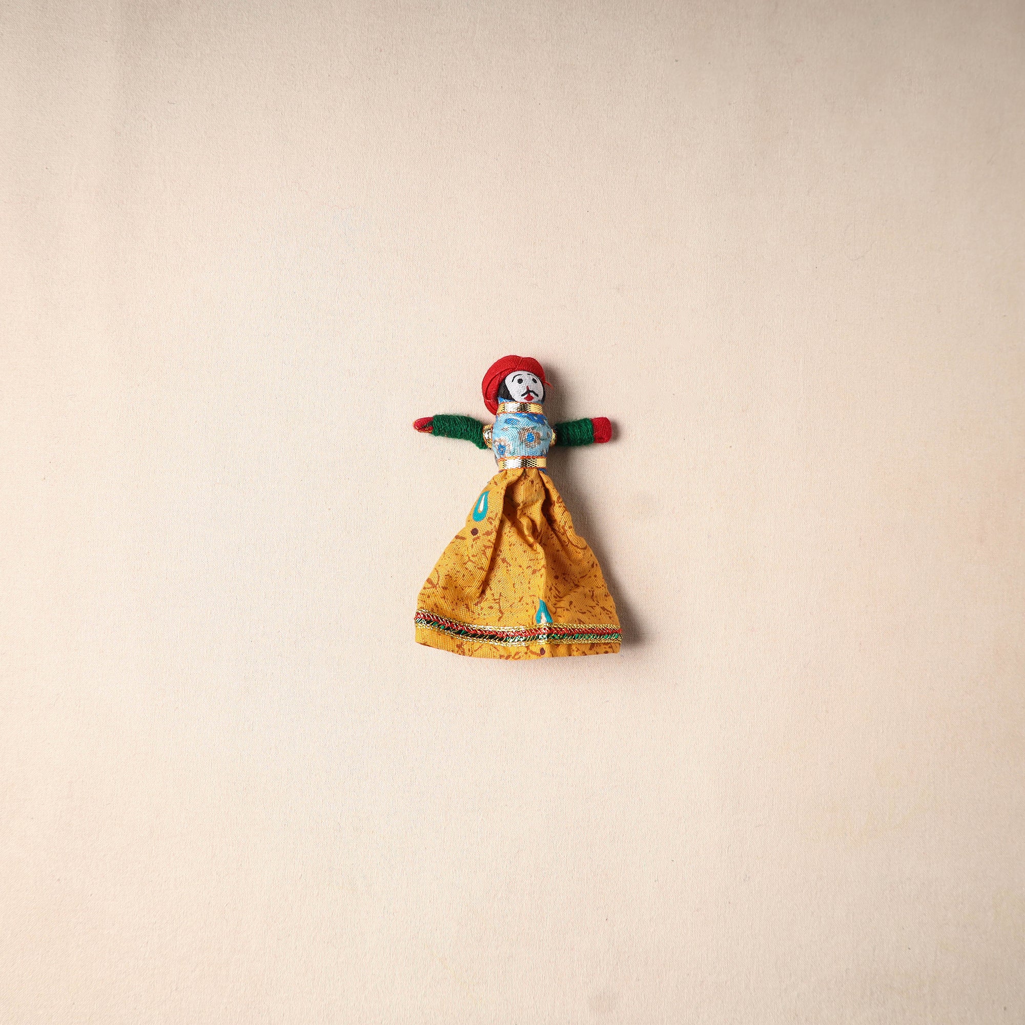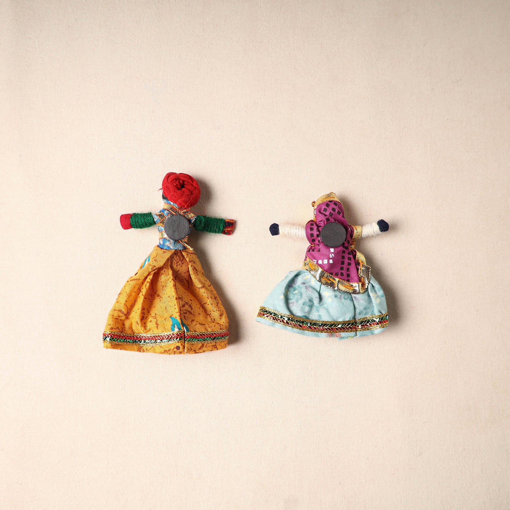 Multicolor Rajasthani puppet couple magnets (set of 2), handcrafted by skilled artisans. Made from vibrant fabric and adorned with gota patti work, these magnets can be placed on your fridge, workstation or magnetic board to bring a unique blend of tradition and cultural charm to your space.