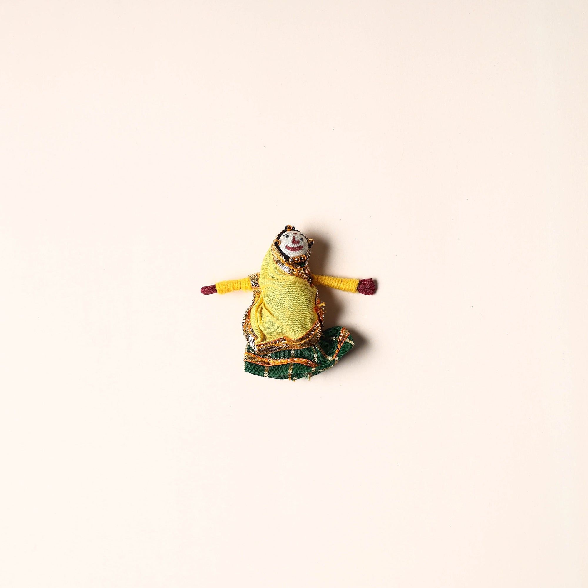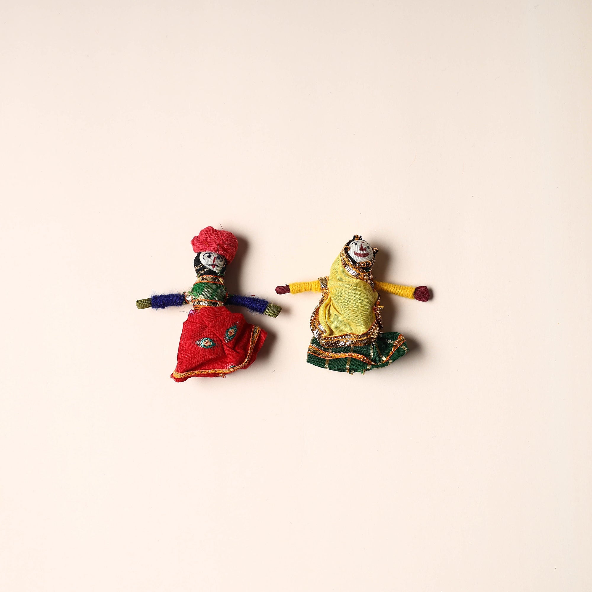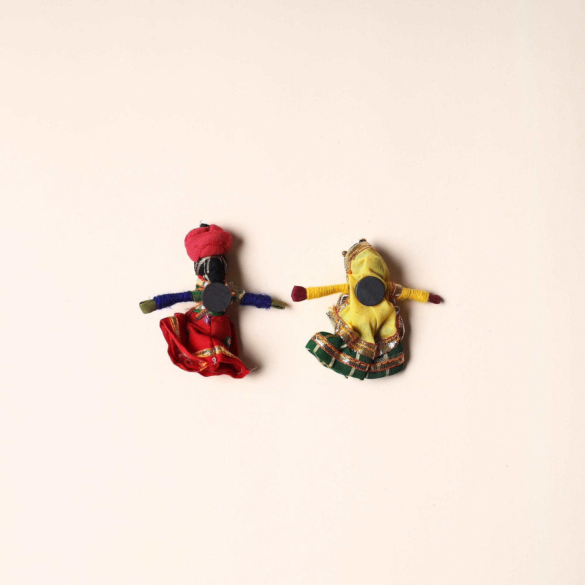 Celebrate the rich artistry of Rajasthan with this rajasthani puppet couple magnet Set (Set of 2), handcrafted by skilled artisans. Made from vibrant fabric and adorned with intricate gota patti work, these magnets add a cultural touch to your home or workspace. Whether placed on your fridge, workstation, or magnetic board, they bring a unique blend of tradition and charm, making them a delightful addition to any space.