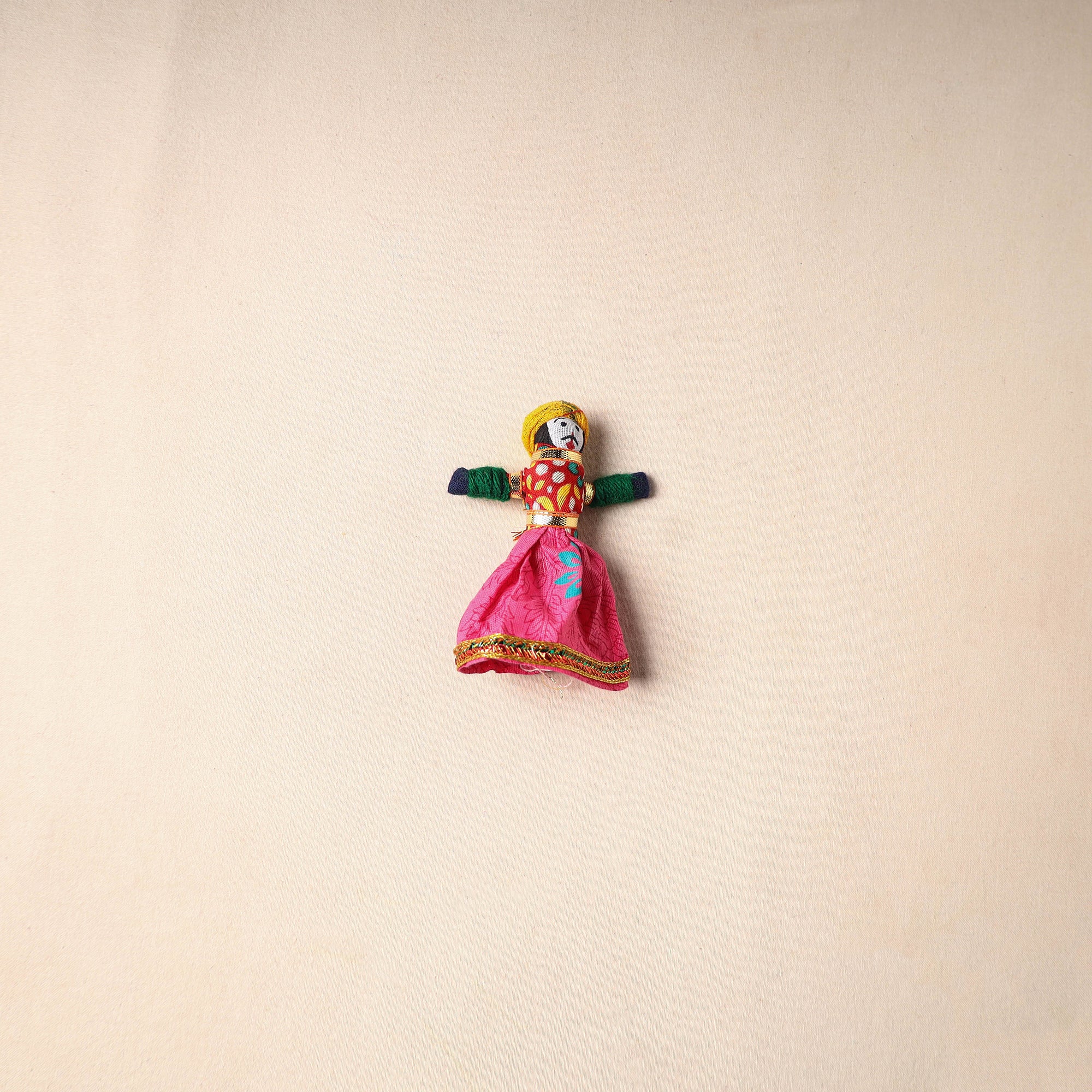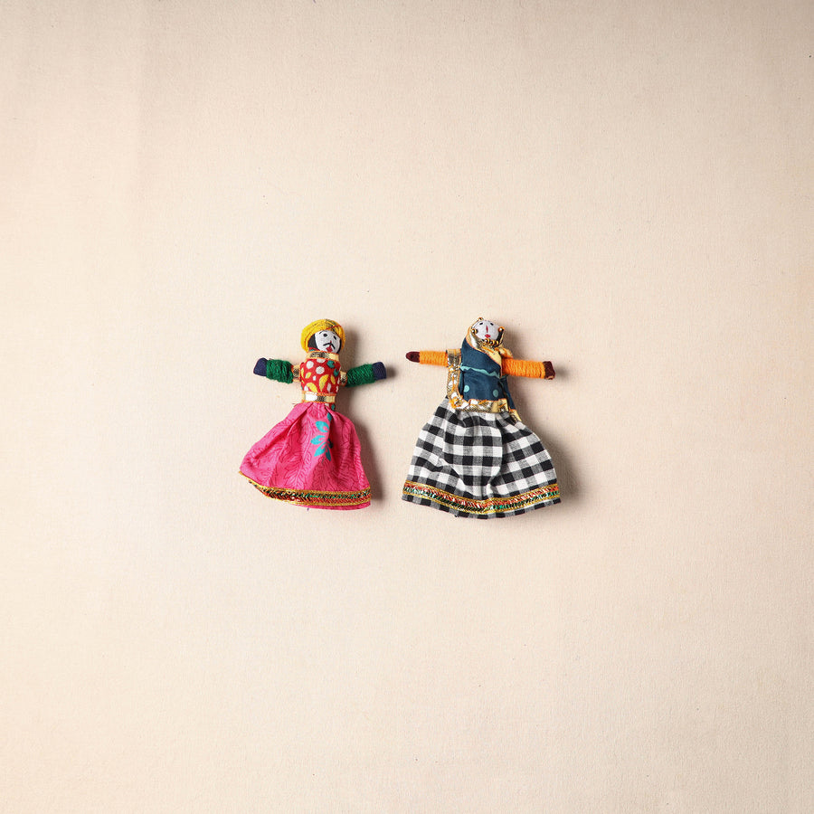 Multicolor Rajasthani puppet couple magnets (set of 2), handcrafted by skilled artisans. Made from vibrant fabric and adorned with gota patti work, these magnets can be placed on your fridge, workstation or magnetic board to bring a unique blend of tradition and cultural charm to your space.