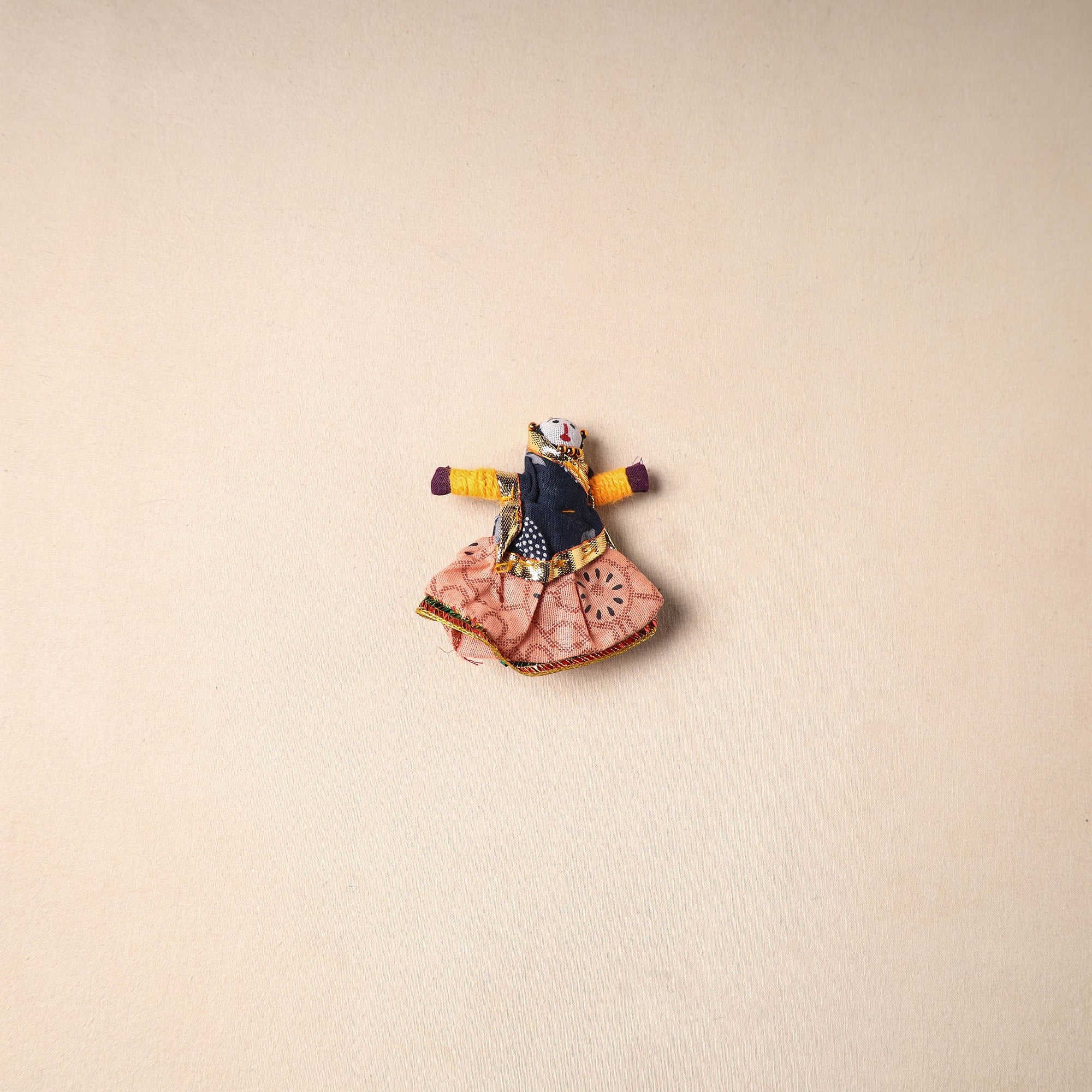 Multicolor Rajasthani puppet couple magnets (set of 2), handcrafted by skilled artisans. Made from vibrant fabric and adorned with gota patti work, these magnets can be placed on your fridge, workstation or magnetic board to bring a unique blend of tradition and cultural charm to your space.