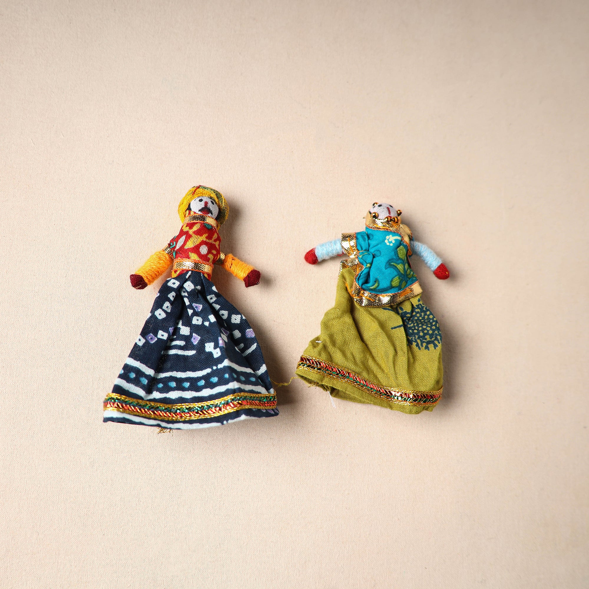 Multicolor Rajasthani puppet couple magnets (set of 2), handcrafted by skilled artisans. Made from vibrant fabric and adorned with gota patti work, these magnets can be placed on your fridge, workstation or magnetic board to bring a unique blend of tradition and cultural charm to your space.