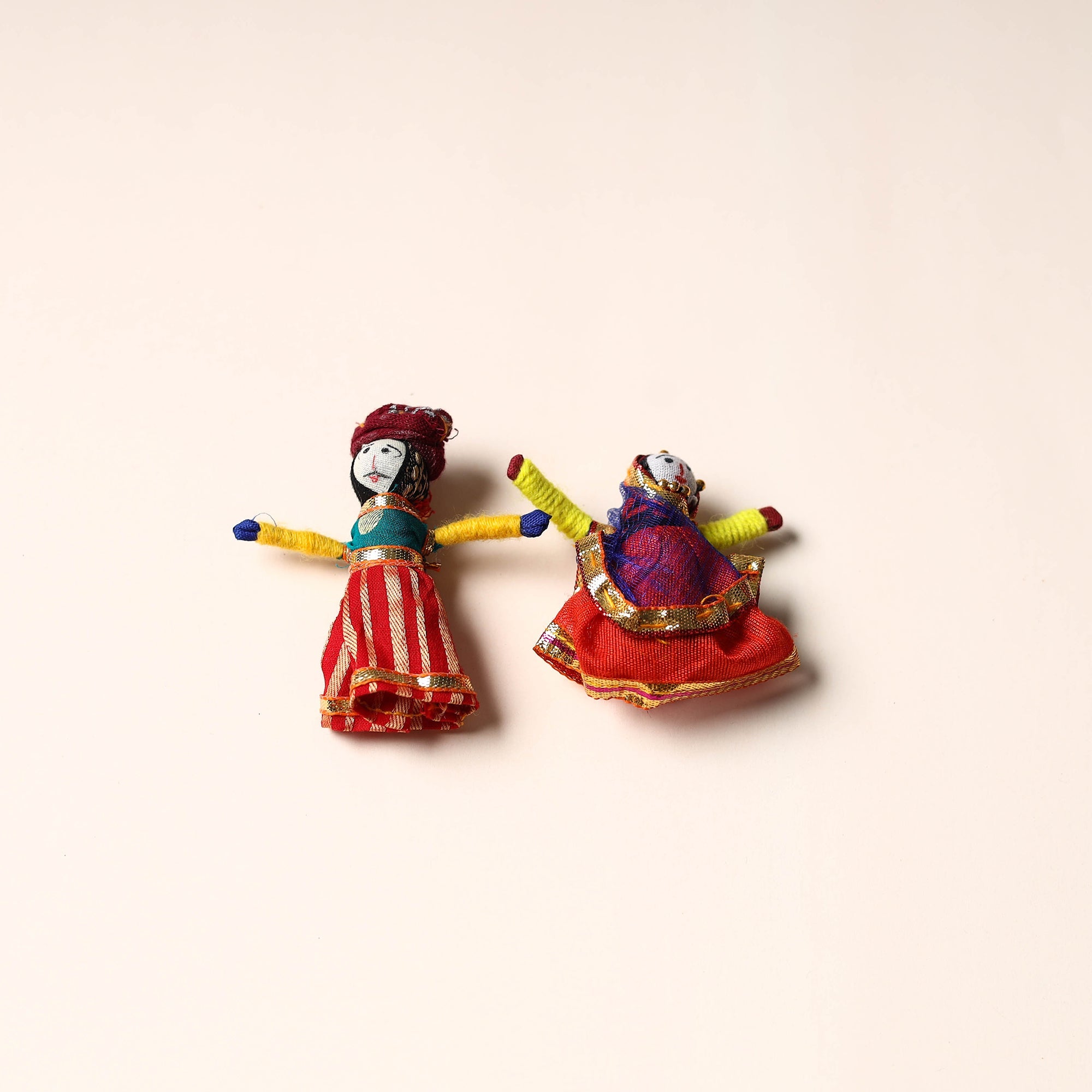 Celebrate the rich artistry of Rajasthan with this rajasthani puppet couple magnet Set (Set of 2), handcrafted by skilled artisans. Made from vibrant fabric and adorned with intricate gota patti work, these magnets add a cultural touch to your home or workspace. Whether placed on your fridge, workstation, or magnetic board, they bring a unique blend of tradition and charm, making them a delightful addition to any space.