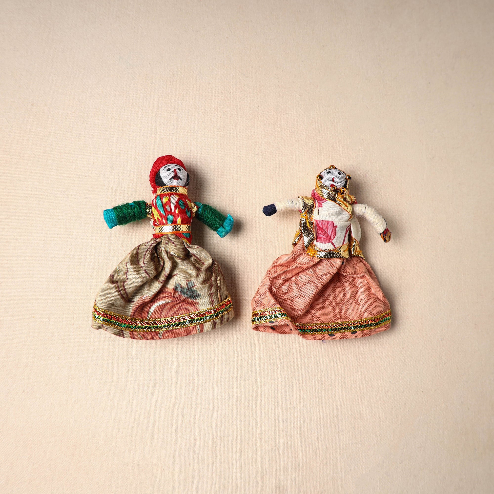 Multicolor Rajasthani puppet couple magnets (set of 2), handcrafted by skilled artisans. Made from vibrant fabric and adorned with gota patti work, these magnets can be placed on your fridge, workstation or magnetic board to bring a unique blend of tradition and cultural charm to your space.