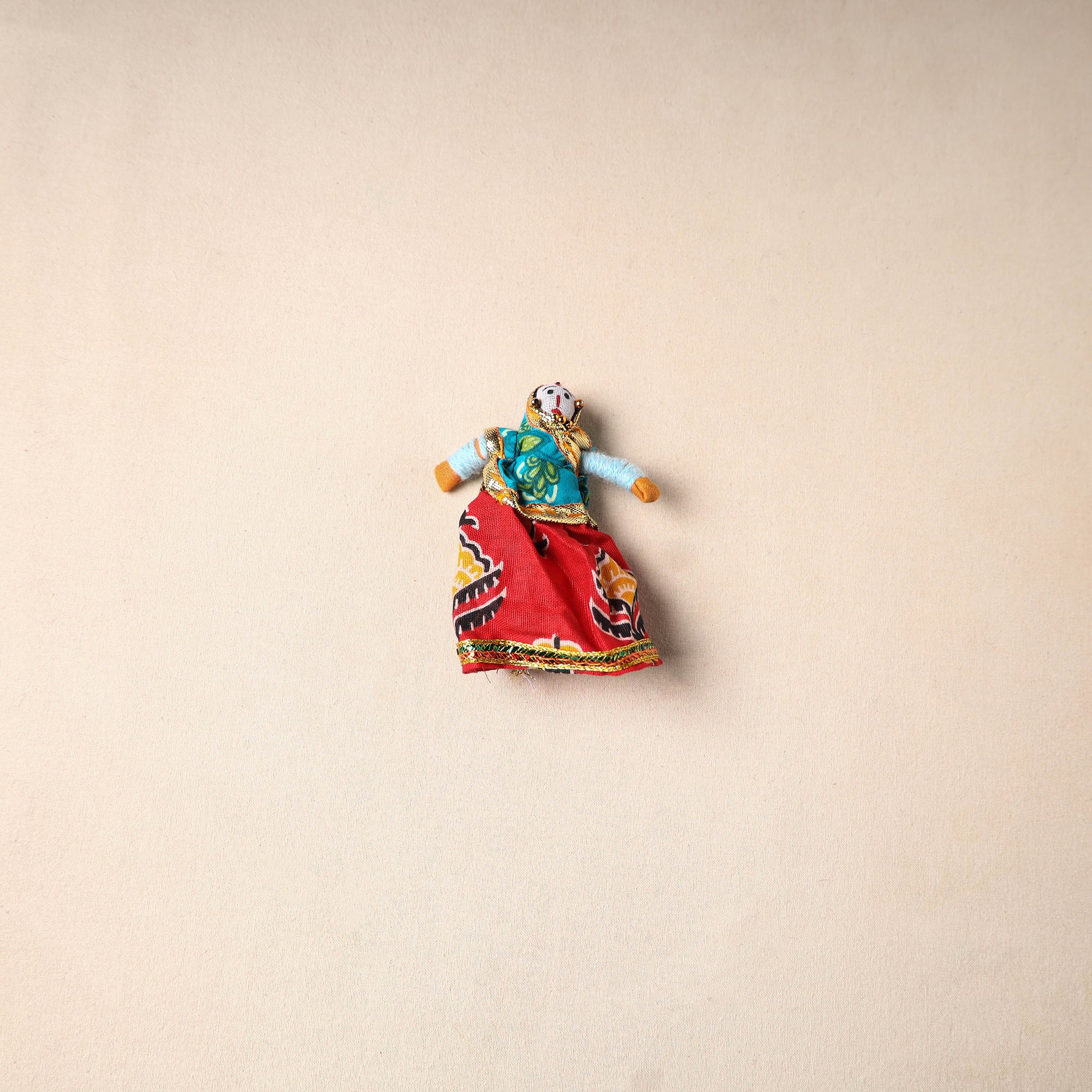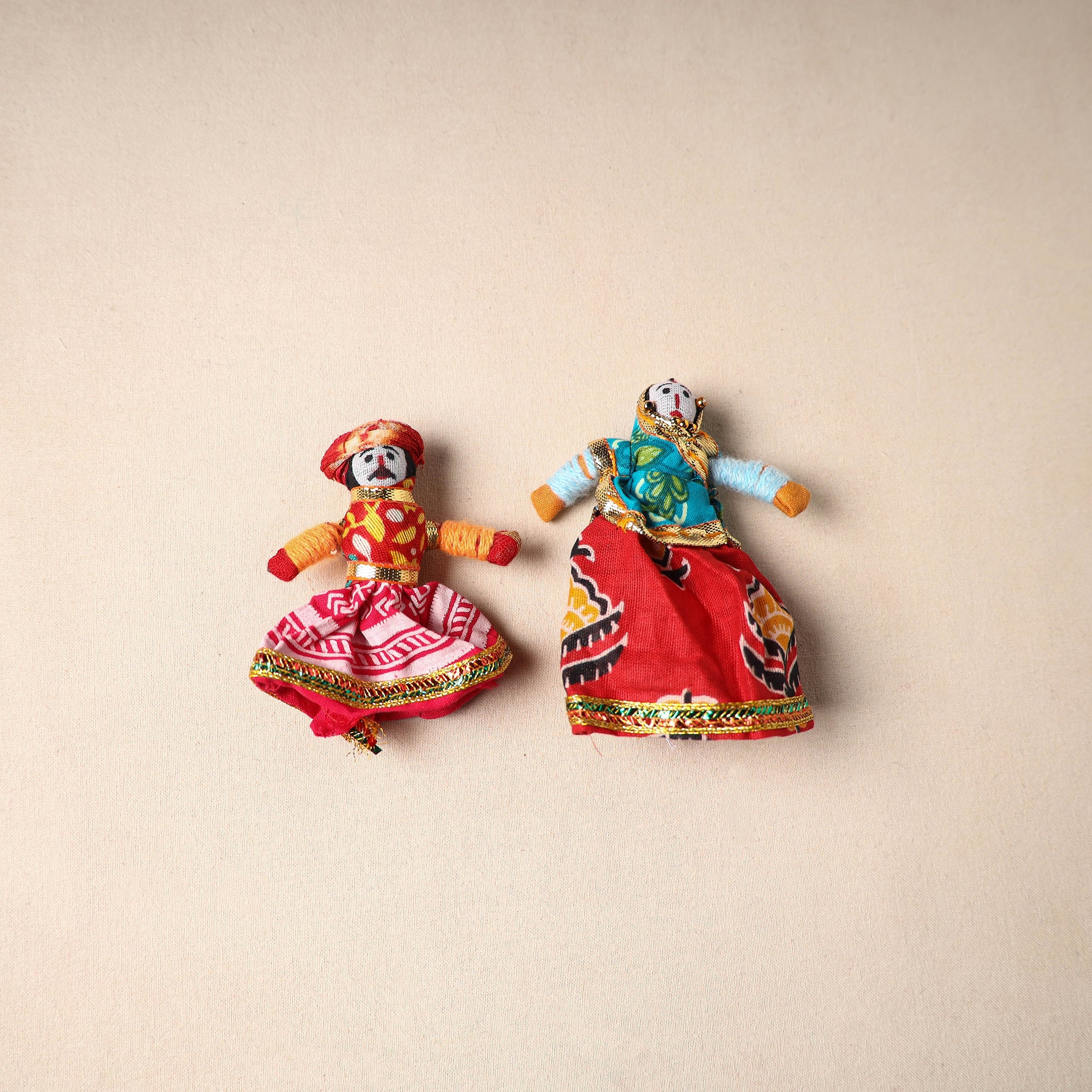 Multicolor Rajasthani puppet couple magnets (set of 2), handcrafted by skilled artisans. Made from vibrant fabric and adorned with gota patti work, these magnets can be placed on your fridge, workstation or magnetic board to bring a unique blend of tradition and cultural charm to your space.
