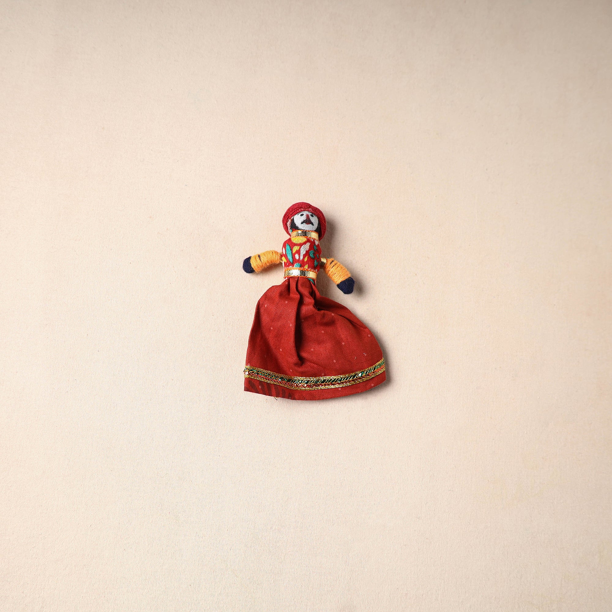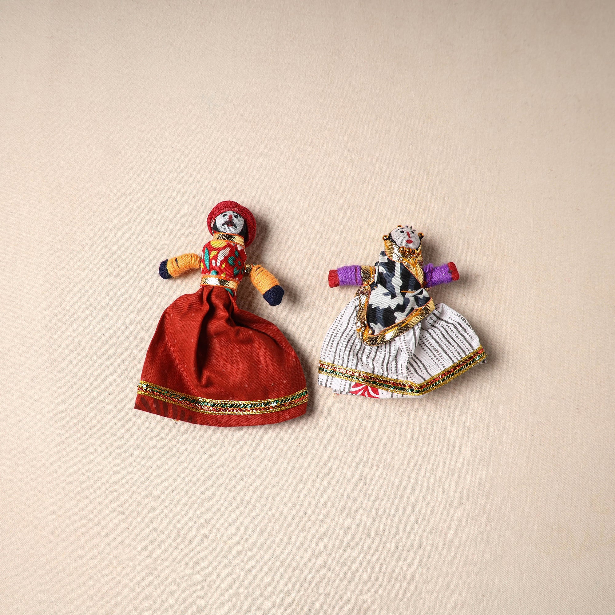 Multicolor Rajasthani puppet couple magnets (set of 2), handcrafted by skilled artisans. Made from vibrant fabric and adorned with gota patti work, these magnets can be placed on your fridge, workstation or magnetic board to bring a unique blend of tradition and cultural charm to your space.