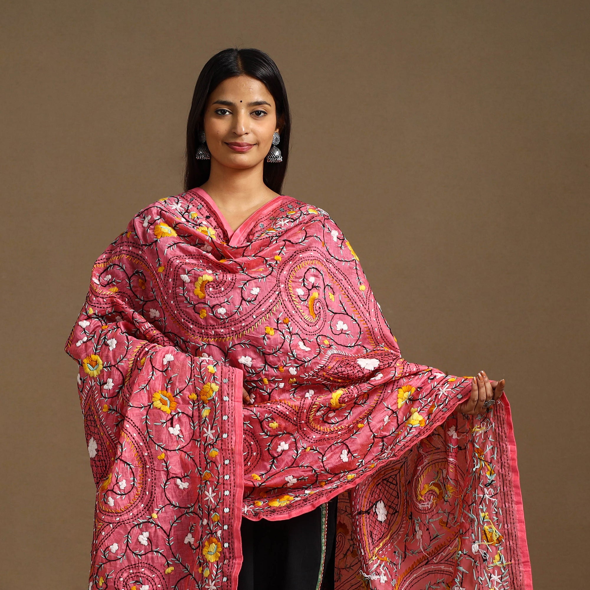 This pink chanderi silk cotton dupatta features traditional hand embroidery in the Ranihati style, known for its dense, intricate threadwork. The fabric has a light texture with a soft sheen making it easy to carry and elegant to wear. Ideal for special occasions or for elevating your everyday ethnic look with something rooted in tradition.