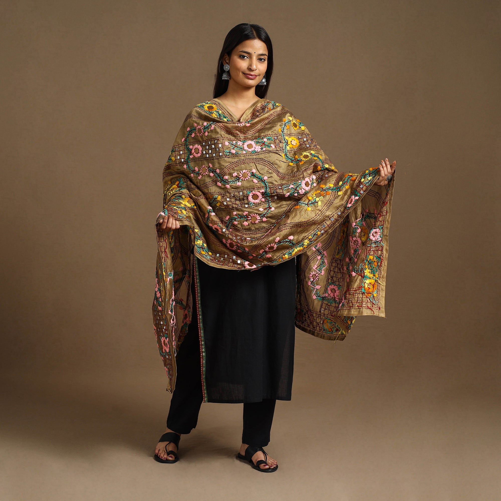 This brown chanderi silk cotton dupatta features traditional hand embroidery in the Ranihati style, known for its dense, intricate threadwork. The fabric has a light texture with a soft sheen making it easy to carry and elegant to wear. Ideal for special occasions or for elevating your everyday ethnic look with something rooted in tradition.