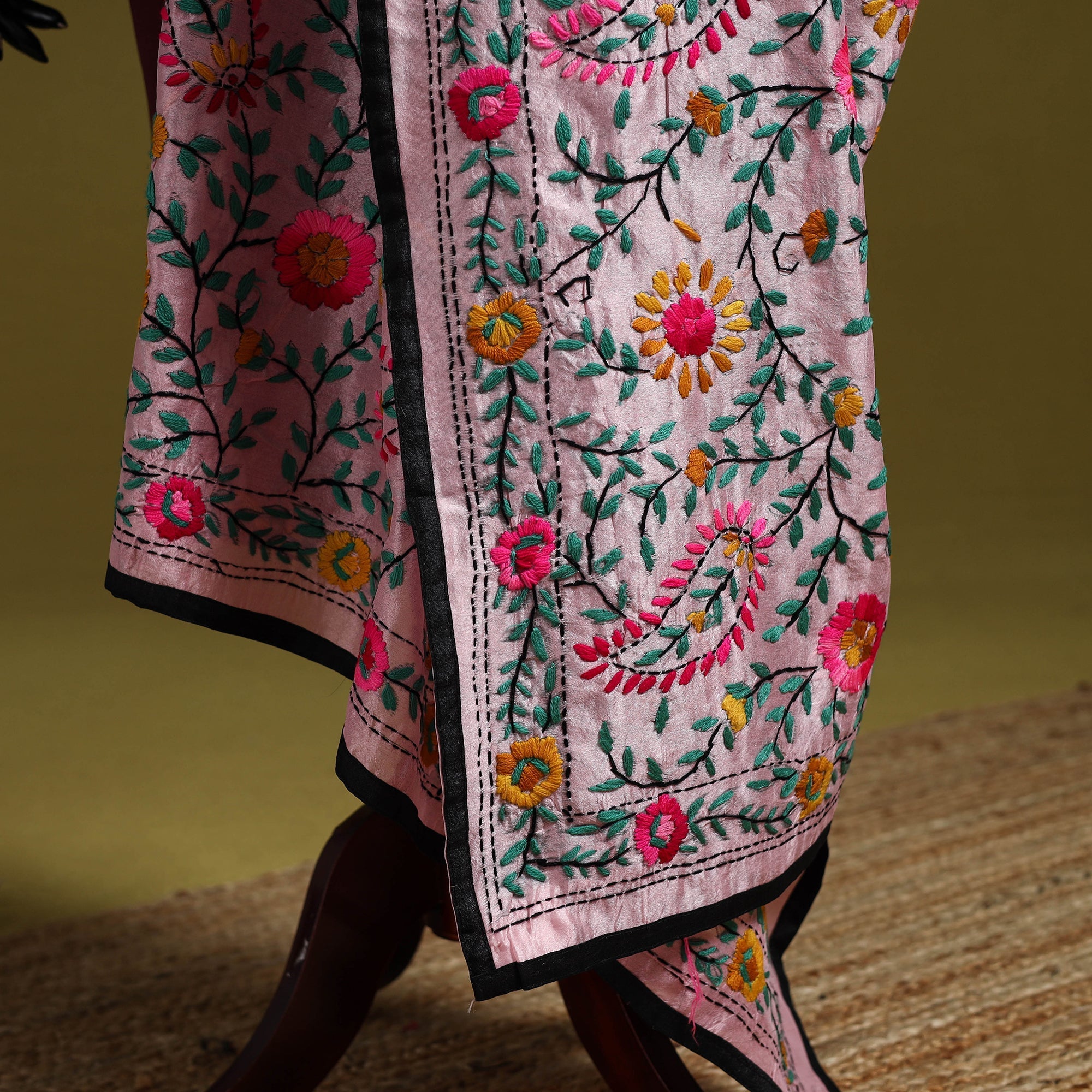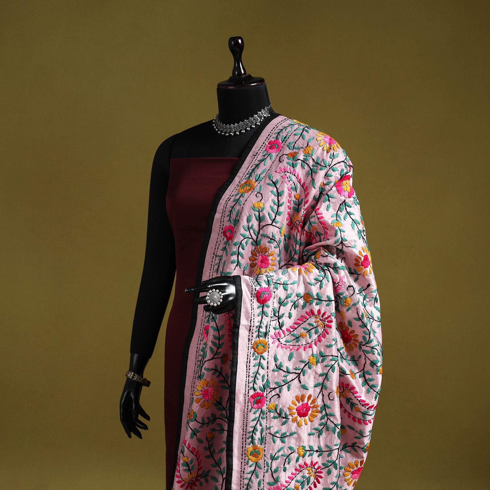 Pink - Ranihati Chapa Work Chanderi Silk Hand Embroidery Dupatta 08